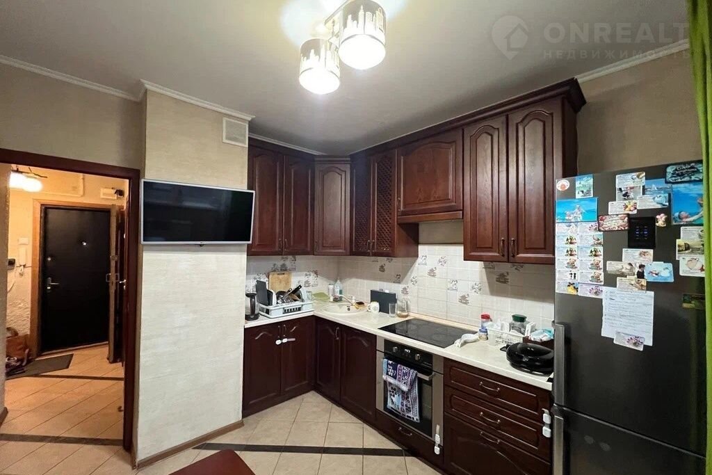 - Большая кухня 8,6 кв.м с современной техникой: холодильник, плита, телевизор.