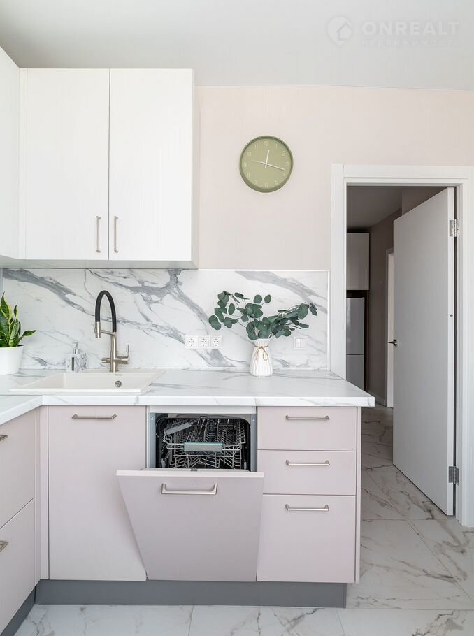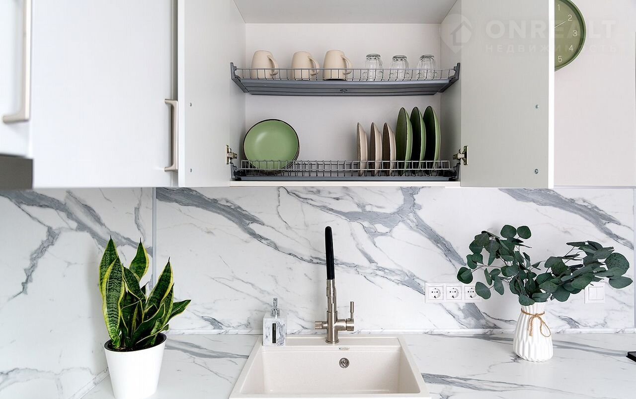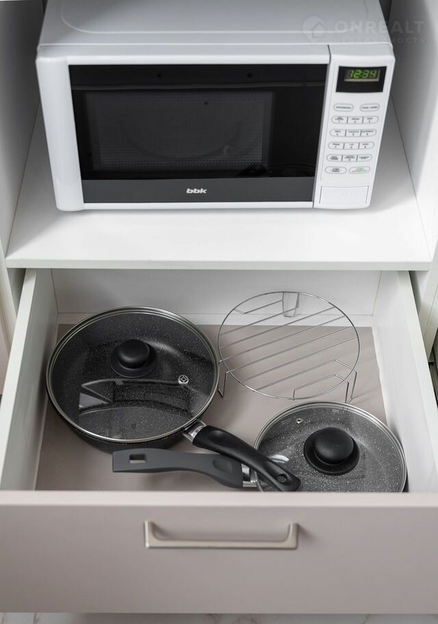 Стиральная машина с сушкой, посудомоечная машина, микроволновая печь, чайник, фильтр для воды на кране, гладильная доска, утюг, сушилка для белья и фен.