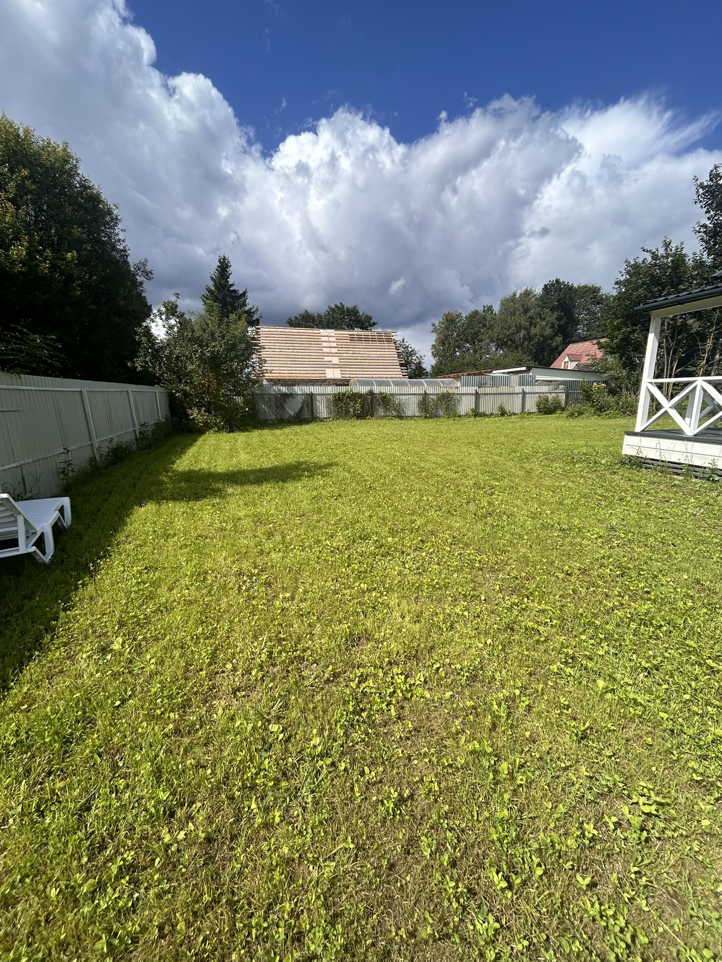 Участок высокий, сухой. Полностью выровнен, отсыпан новой плодородной землей, посажен газон. Установлена система автополива.