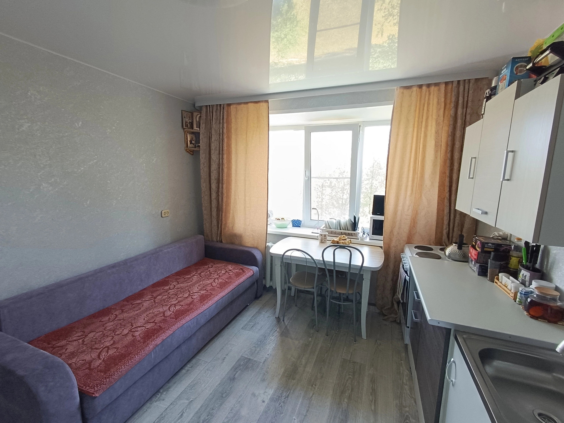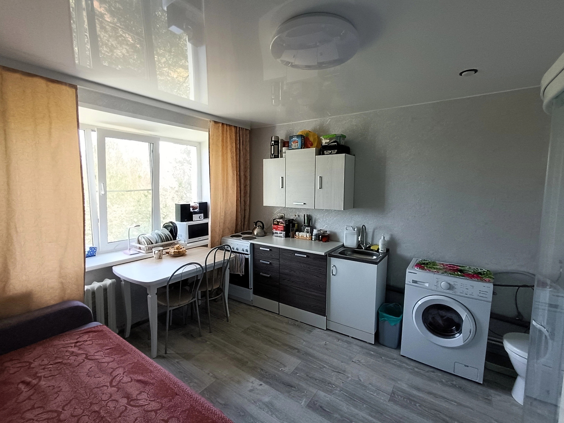в комнате кухня, душ, хороший ремонт