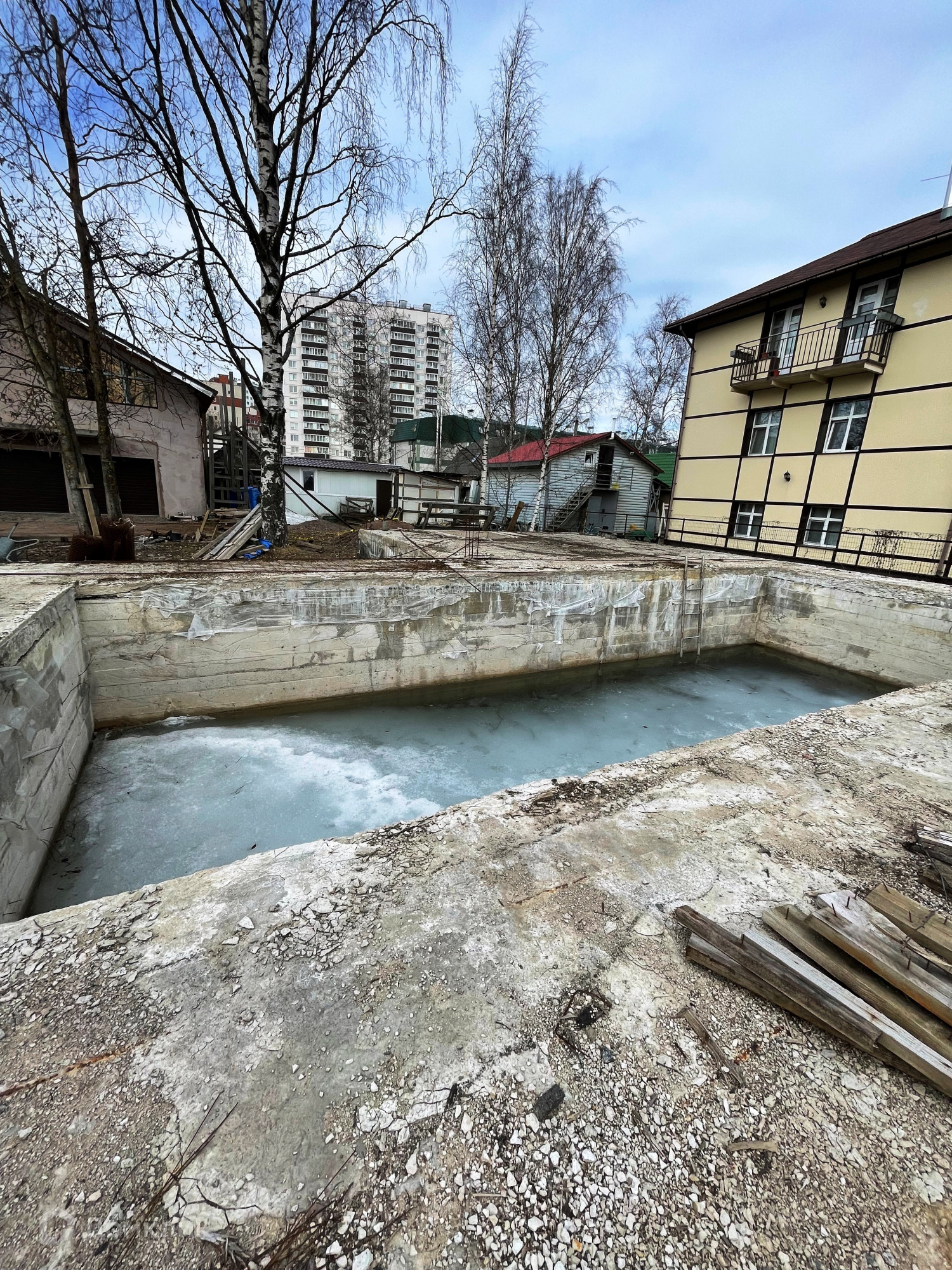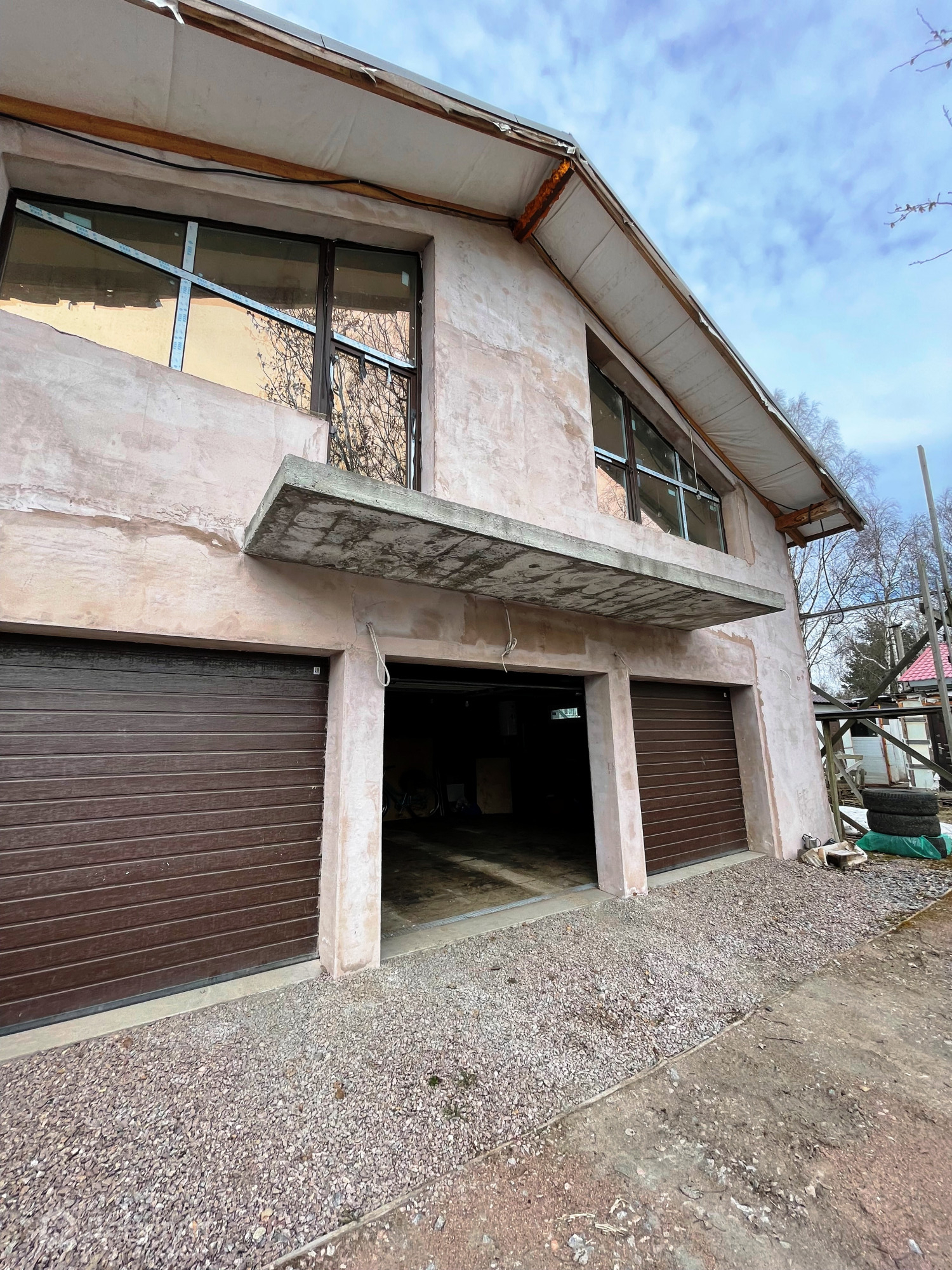 Участок на въезде отсыпан гравием, есть фундамент под бассейн (предусмотрены технические помещения и комната для отдыха), в гараж помещается 3 большие машины. На участке есть место для посадок или зоны отдыха.