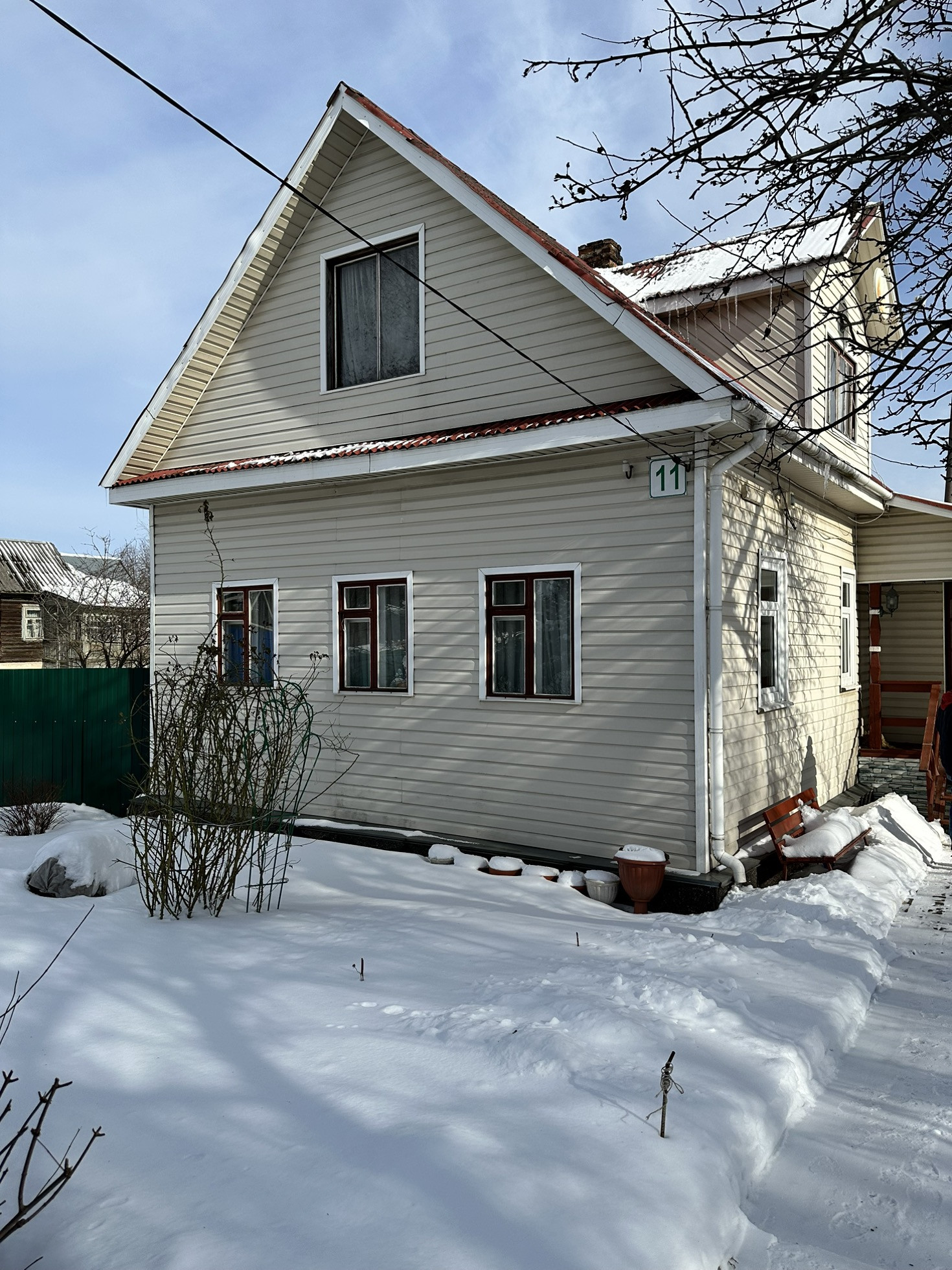 Улица освещена, зимой чистят снег, летом асфальт. Удобный подъезд к дому, где можно поставить не одну машину. Участок огорожен и ухожен. Много цветов и плодоносящих деревьев.
