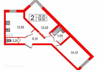 Общая площадь: 58.9 м2