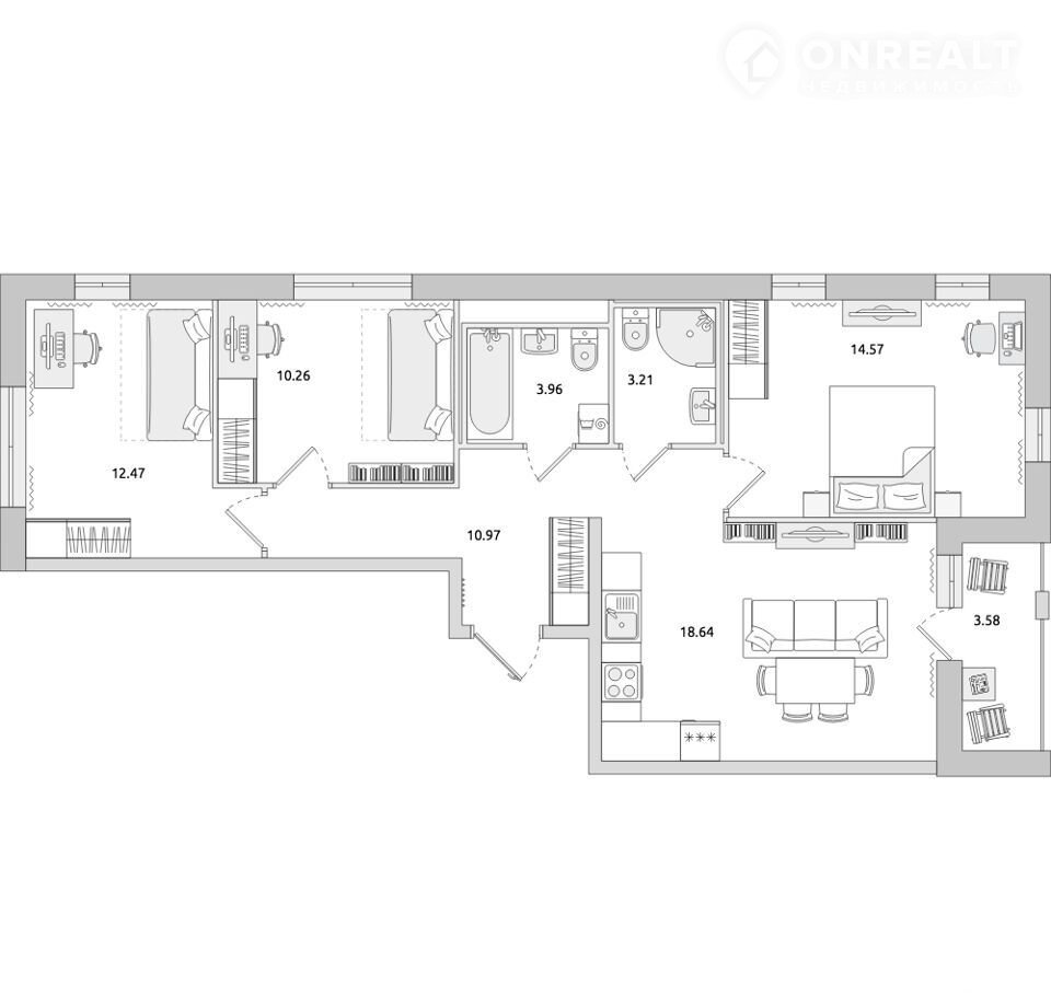 3-комнатная квартира, 73.7 м2, этаж 12 / 17, на продажу в Мурино, улица Шоссе в Лаврики, 51