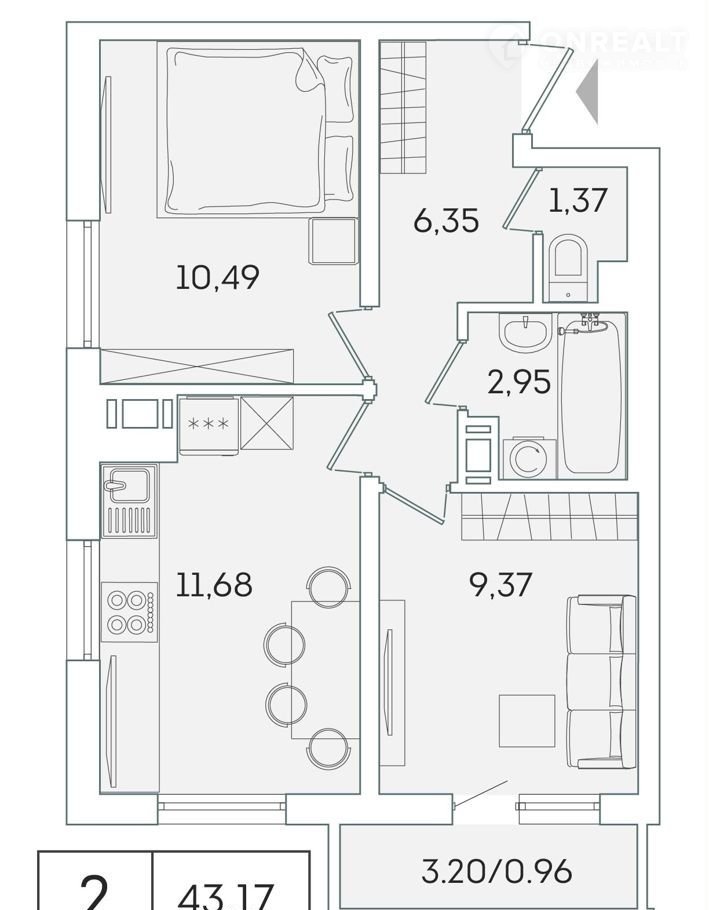 Общая площадь 42.5 м2