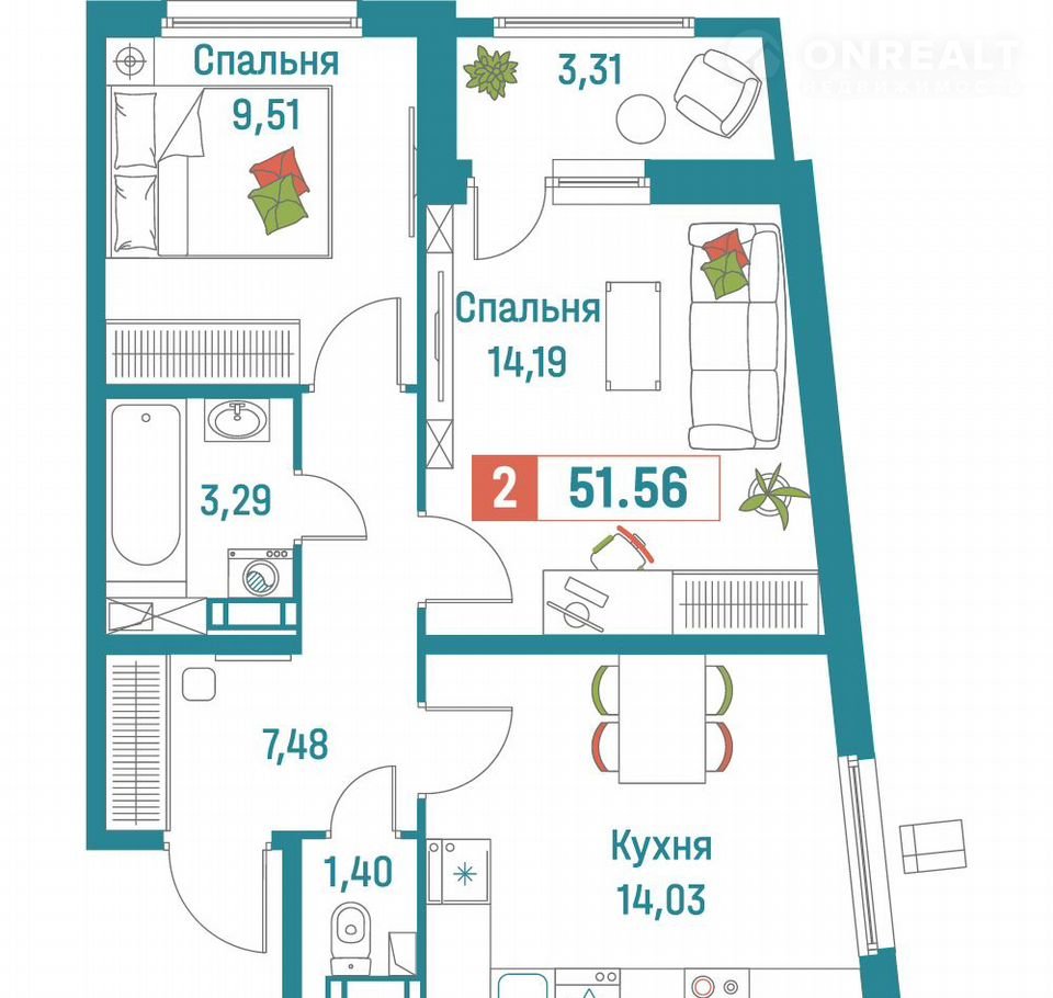 Общая площадь 51.6 м2