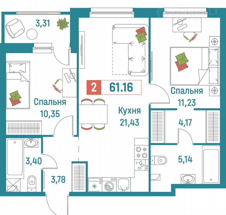 Общая площадь 61.2 м2
