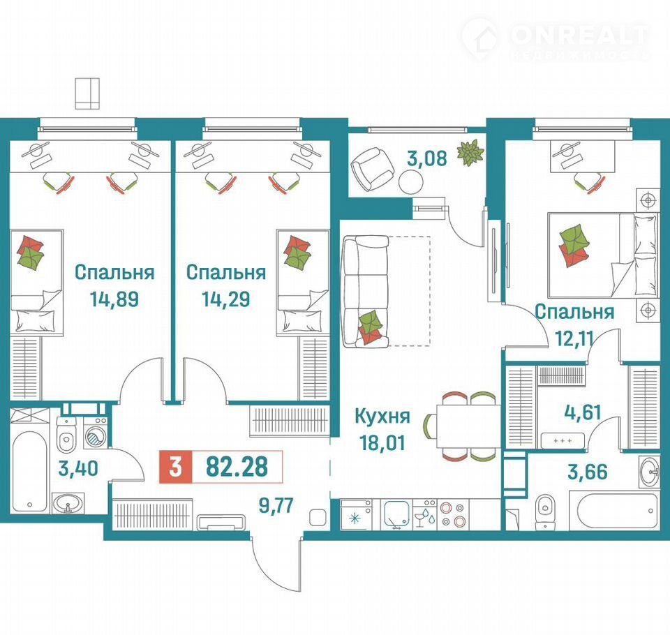 3-комнатная квартира, 82.3 м2, этаж 7 / 18, на продажу в Мурино