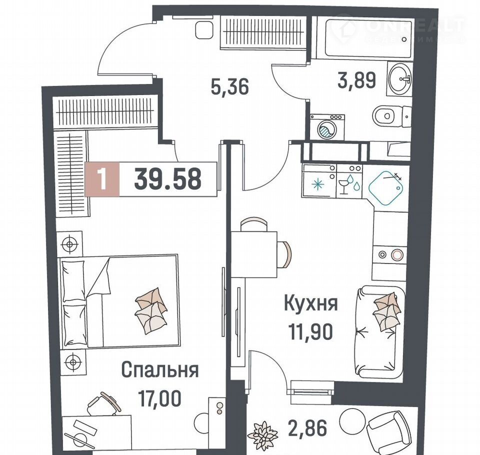 1-комнатная квартира, 39.6 м2, этаж 4 / 18, на продажу в Мурино