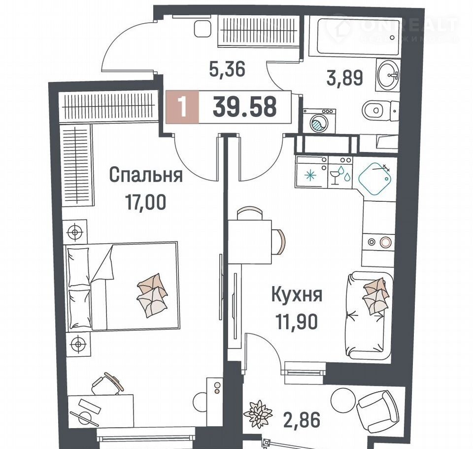 1-комнатная квартира, 39.6 м2, этаж 12 / 18, на продажу в Мурино