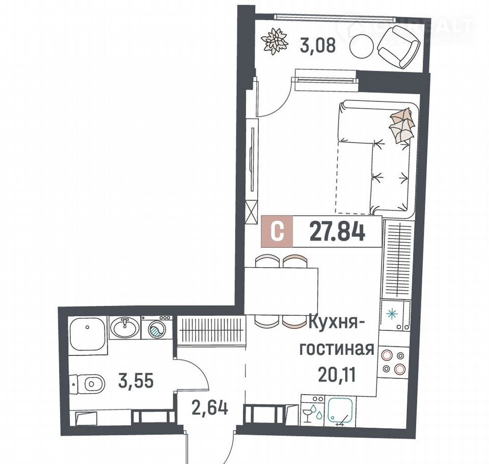 Общая площадь 27.8 м2