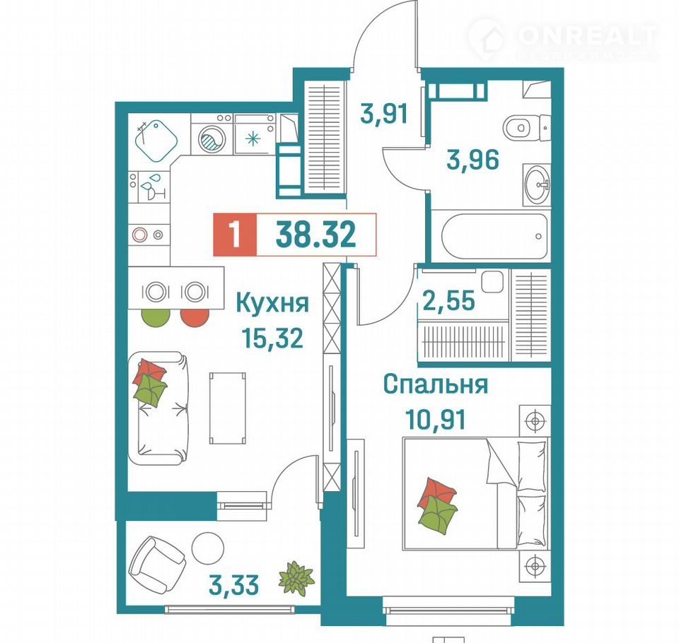 Общая площадь 38.3 м2