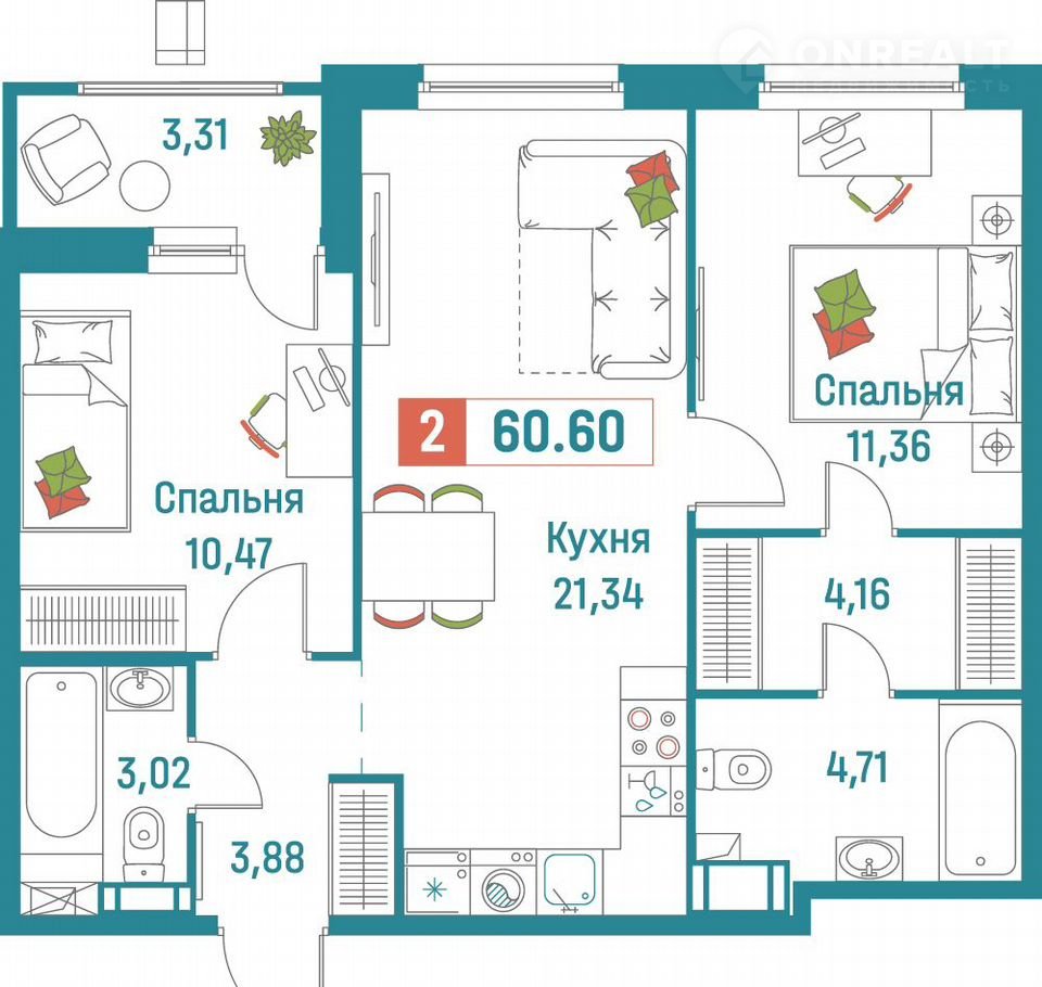 Общая площадь 60.6 м2