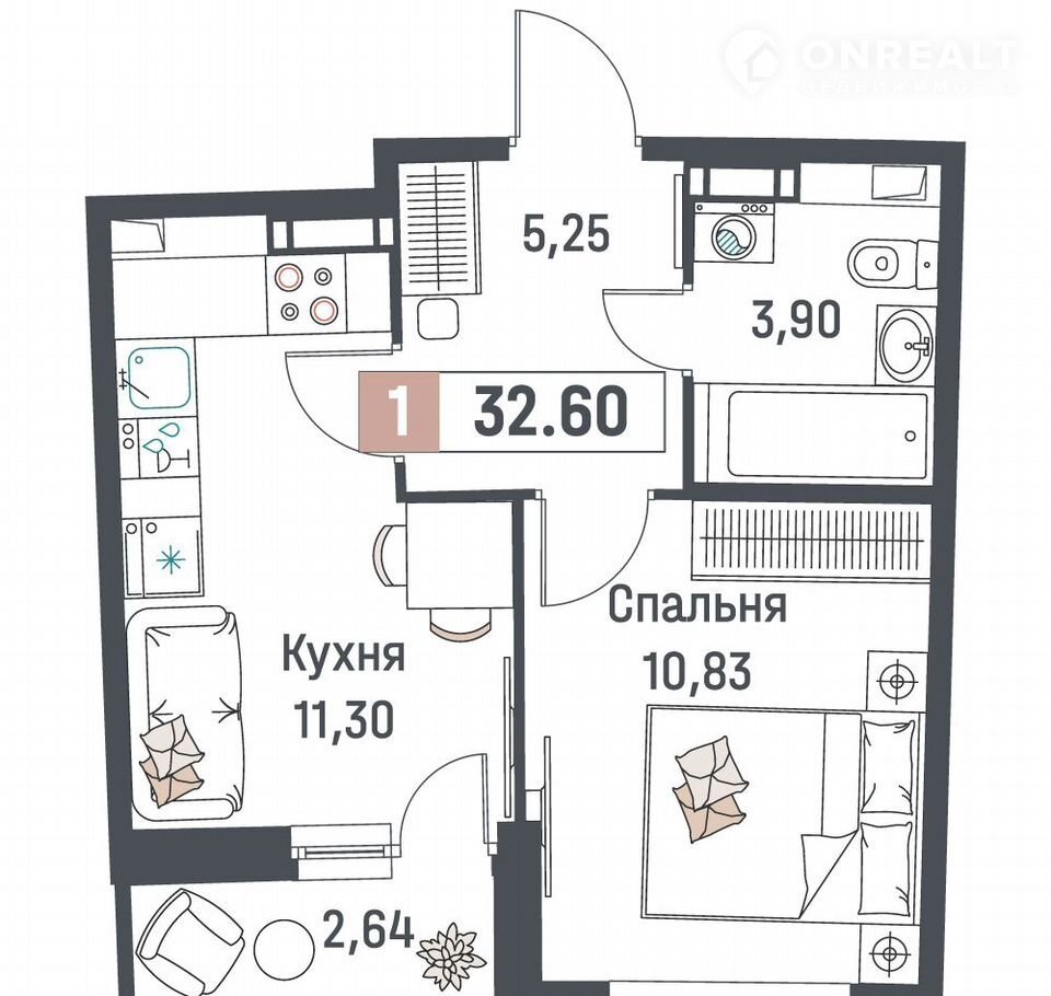 Общая площадь 32.6 м2