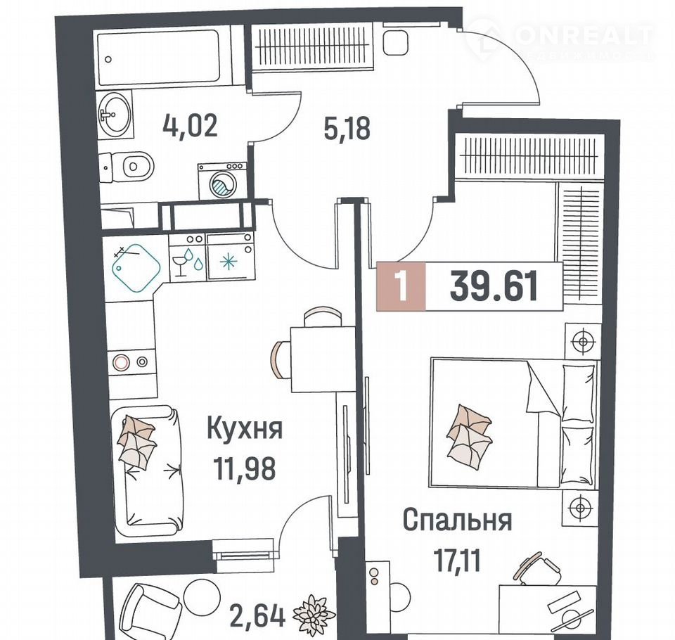 1-комнатная квартира, 39.6 м2, этаж 18 / 18, на продажу в Мурино