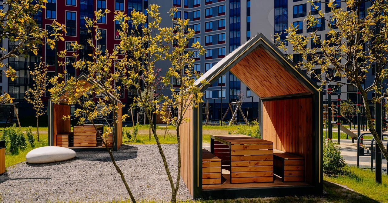 Квартал выполнен в скандинавском стиле с элементами хюгге: уютные беседки, деревянная мебель и тёплое освещение в закрытых дворах. В подъездах – просторные колясочные и сквозные выходы во двор и на улицу.
