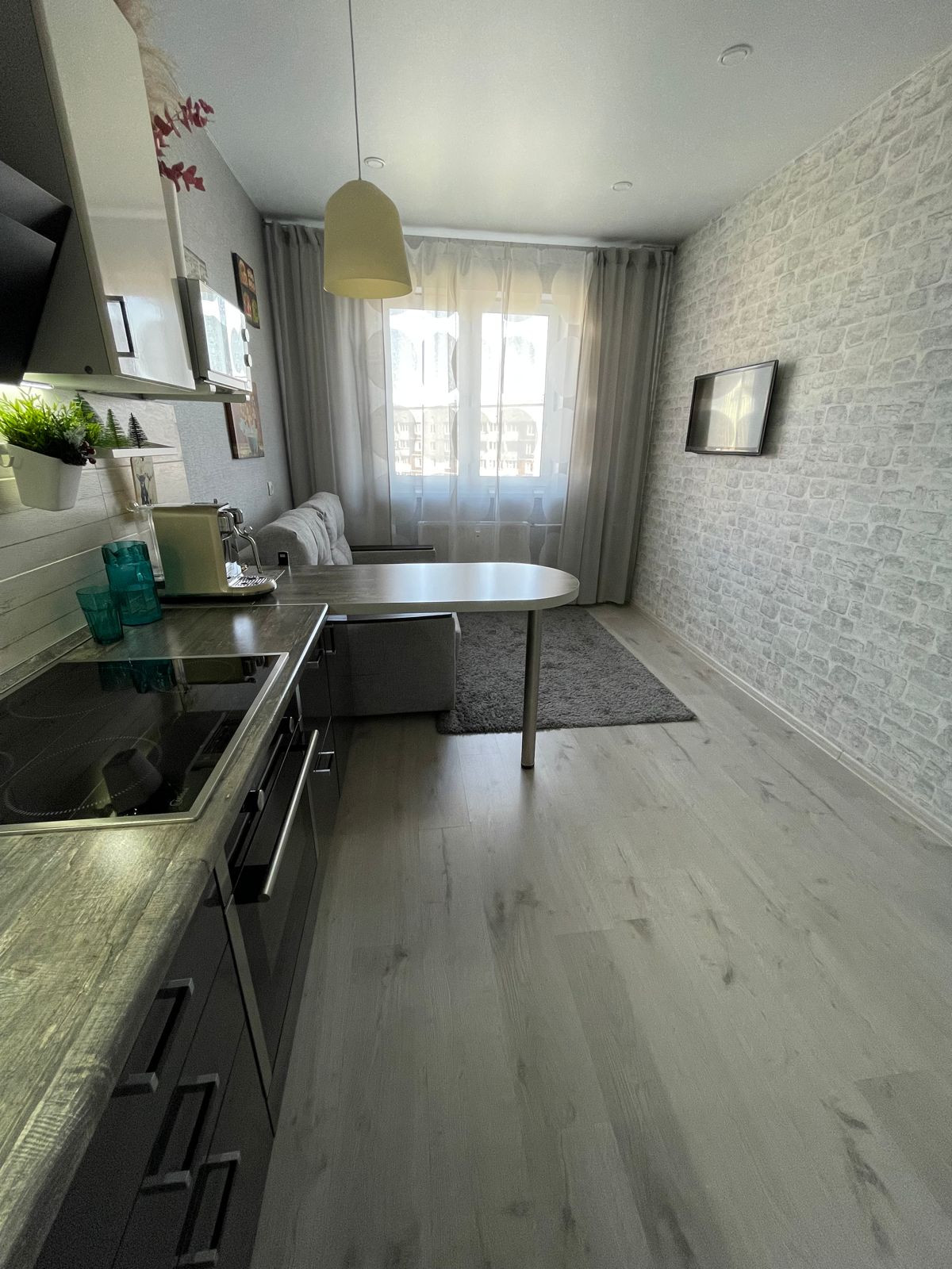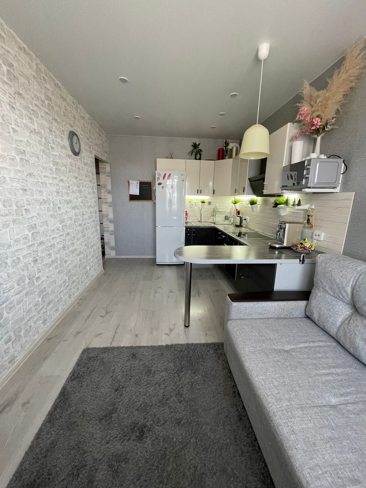 Квартира с большой кухней-гостиной общей площадью 33,8 кв.м + 3,3 кв.м застекленный балкон можно использовать как зону отдыха или дополнительное место хранения .