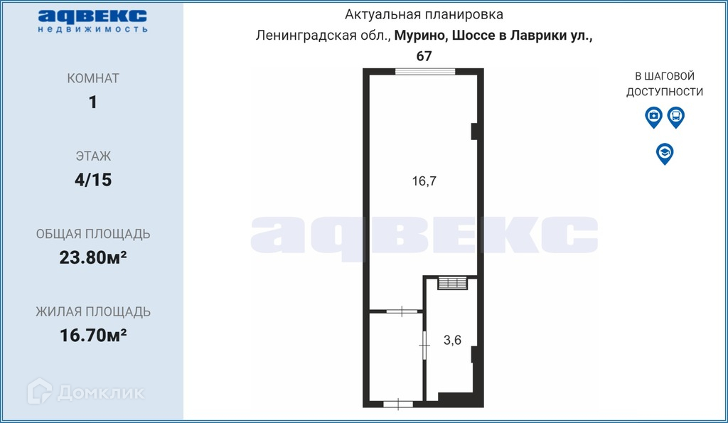 Квартира студия, 23.8 м2, этаж 4 / 15, на продажу в Мурино, улица Шоссе в Лаврики, 67