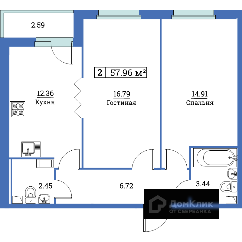 Общая площадь 57.96 м2