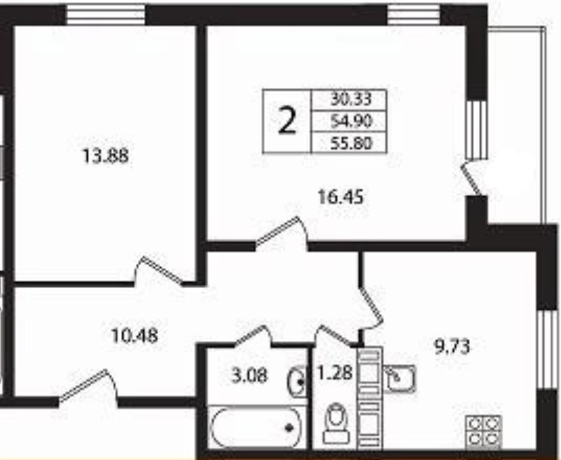 Общая площадь 54.9 м2