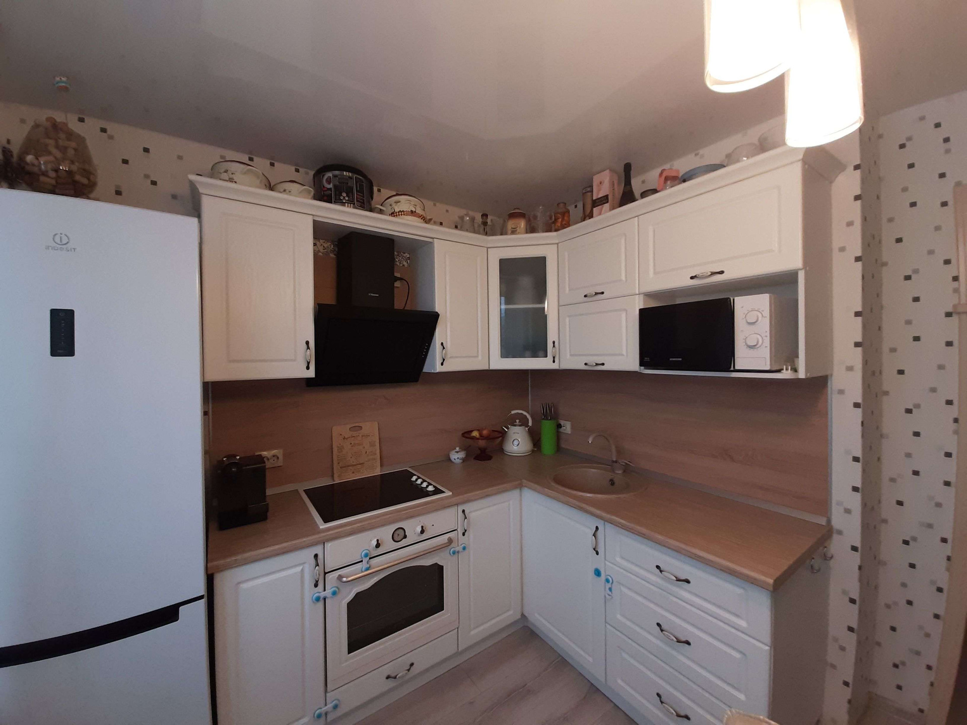 На кухне качественный кухонный гарнитур со встроенной техникой.