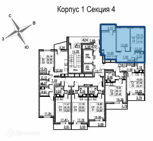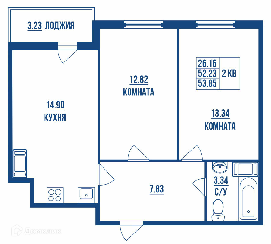 О квартире: 2х-комнатная квартира, общей площадью 53.85 м², кухня - 14.9 м², комната 1 - 12.82 м², комната 2 - 13.34 м², прихожая - 7.83 м², санузел - 3.34 м², лоджия - 3.23 м².