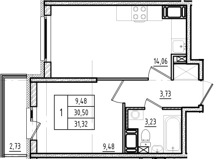 Площадь кухни 14.43 м2