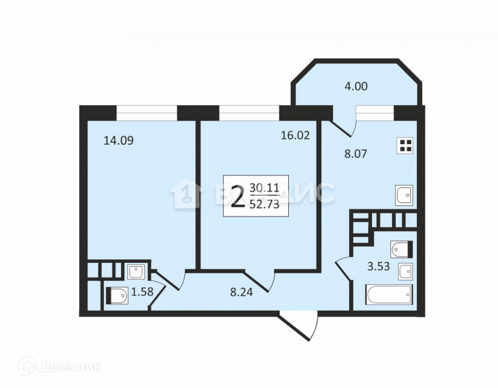 Общая площадь 51.9 м2