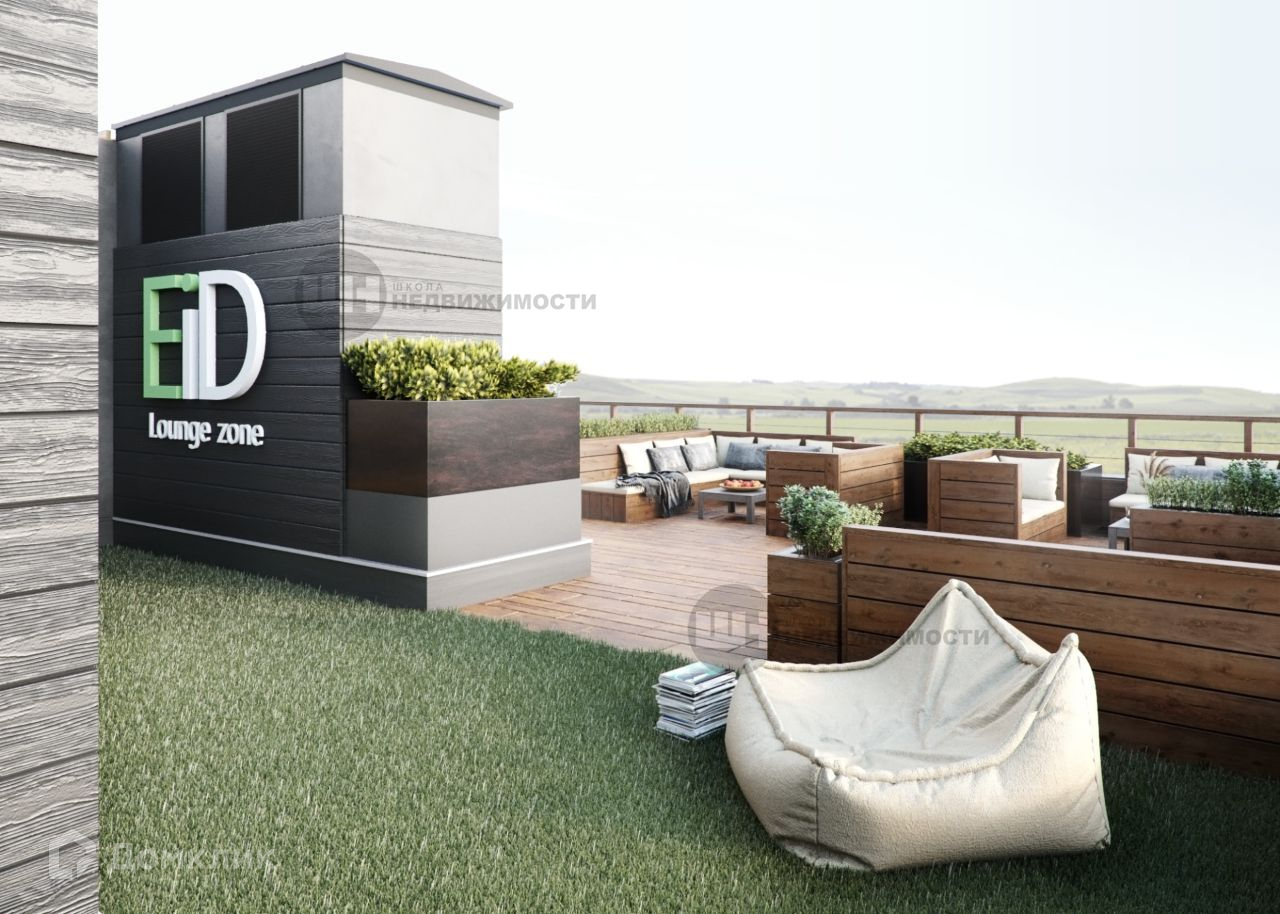 Есть Лаунж зона на крыше, где также установлена чаша-барбекю, деревянные скамейки и столы, много клумб с цветами.