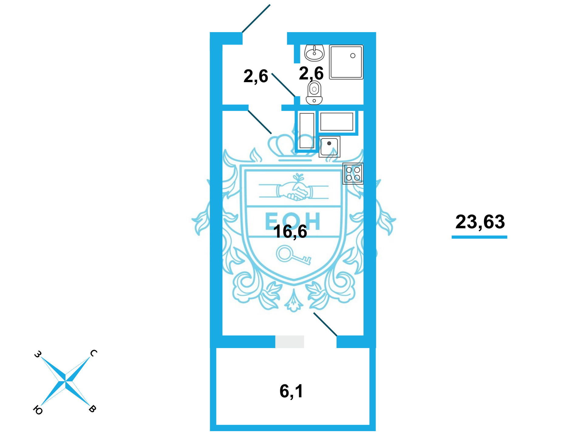 –    Студия вместе с лоджией имеет площадь 27.8 кв.м.
