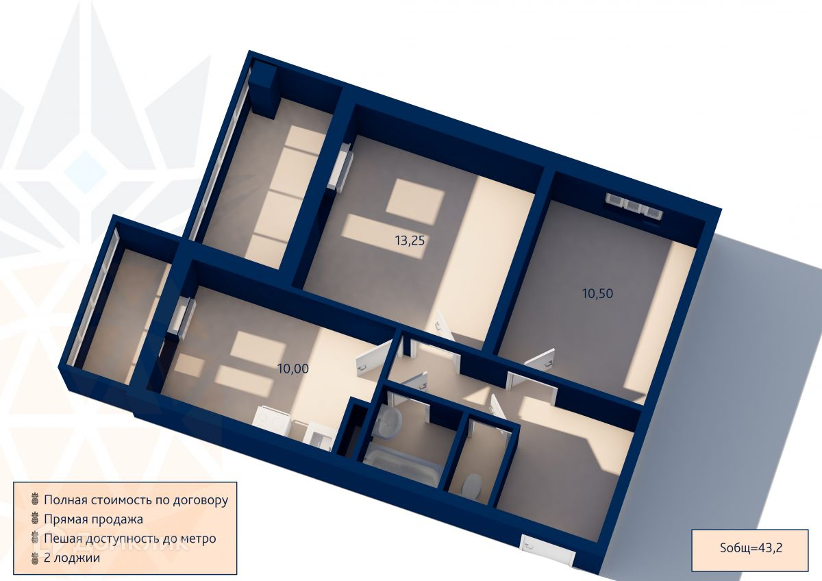 Общая площадь 43.2 м2