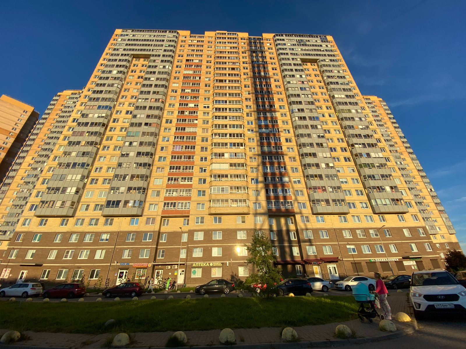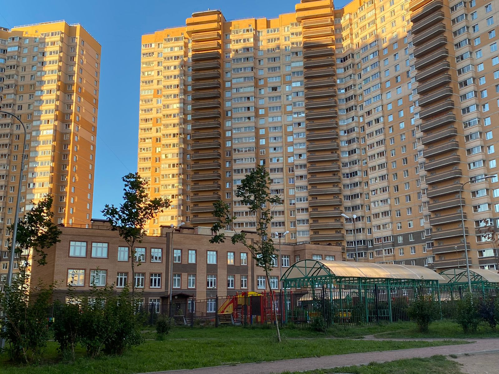 Район с уже сложившейся инфраструктурой. Во дворе дома - школа и детский сад, детская площадка, магазин Светофор, Дикси, Красное и Белое, Росал, Пятерочка.  Под окнами делают парк (окончание ремонтных работ – конец осени 2022года). В 15-ти минутах ходьбы протекает река Охта, с парком и местами для семейных прогулок.