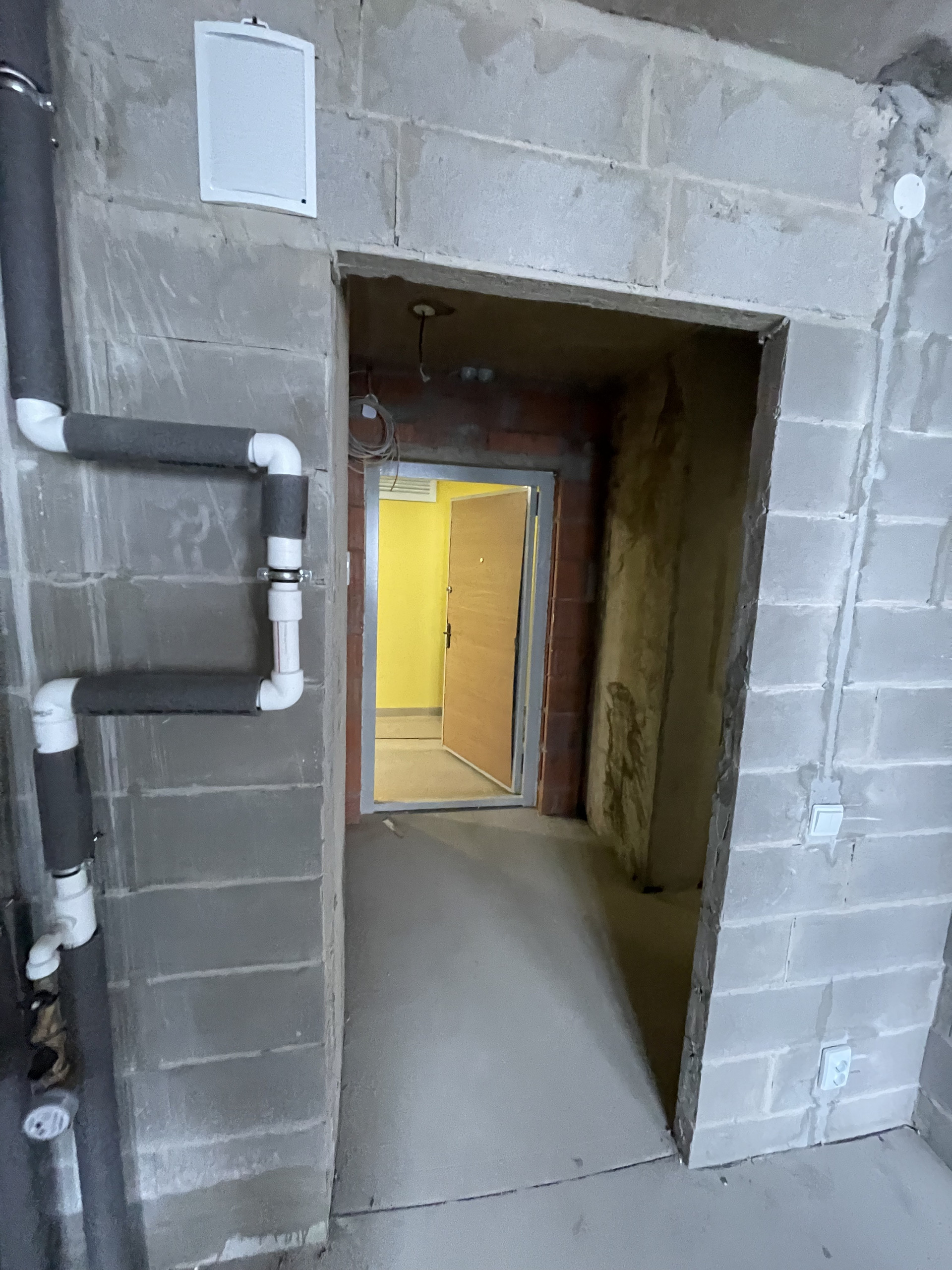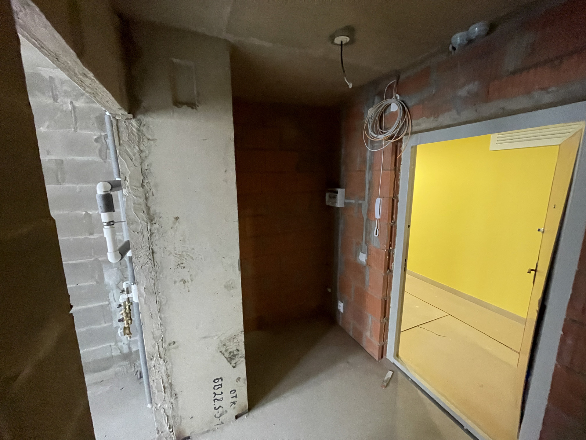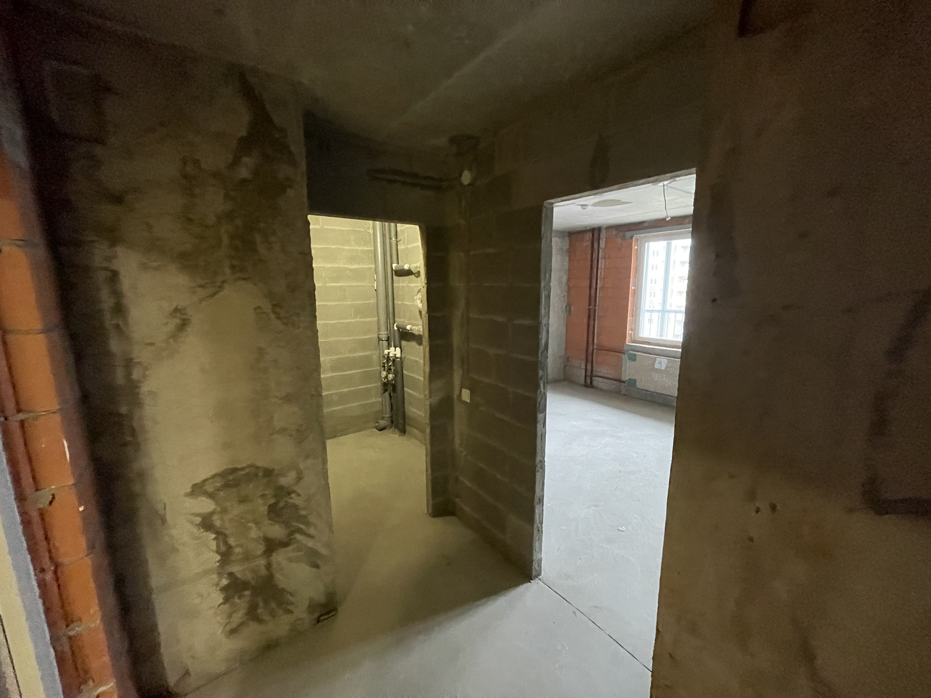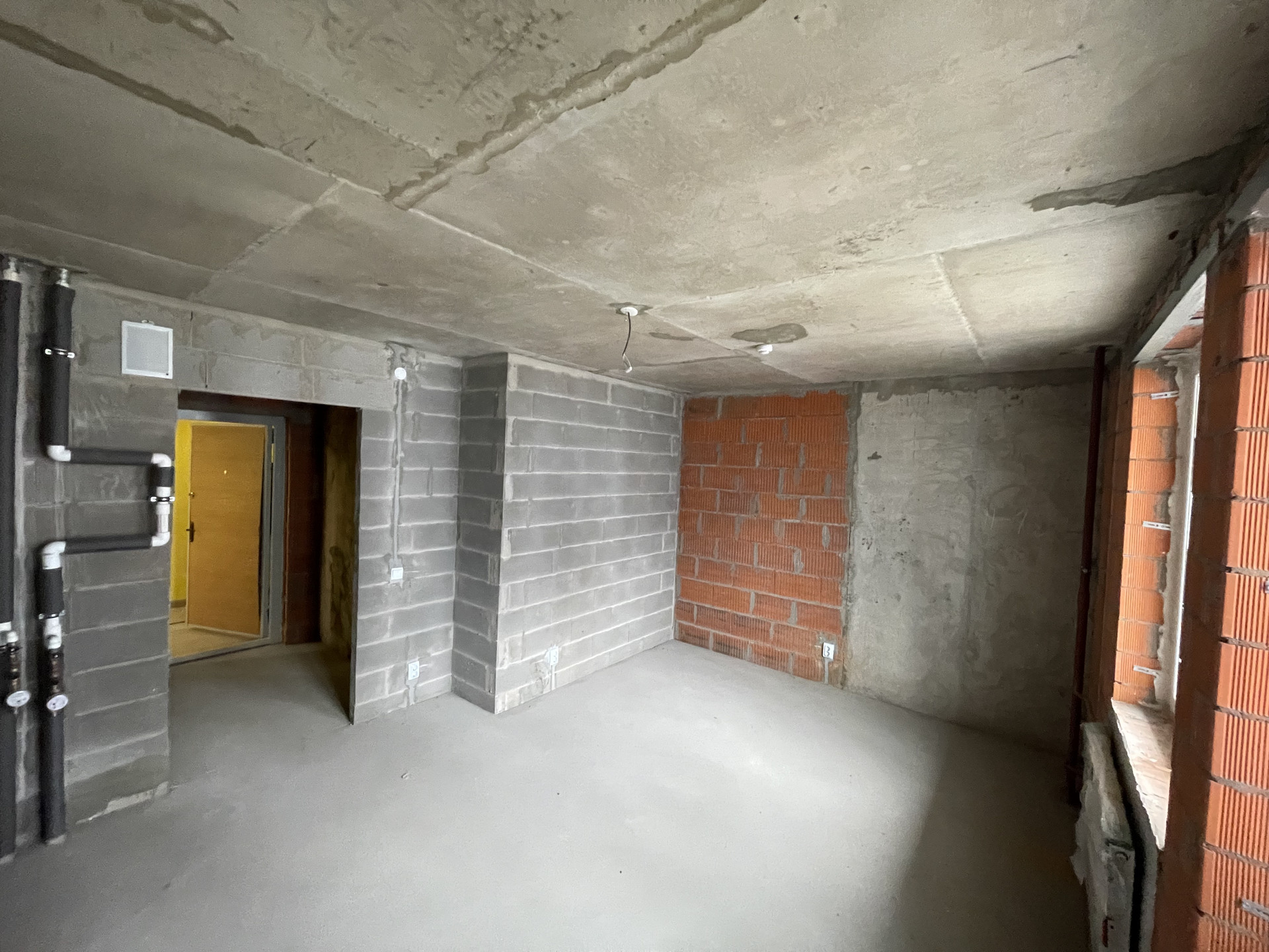 Пол стяжка, смонтированы выпуски разводки холодного и горячего водоснабжения, выводы под сантехнику, установлены современные радиаторы.