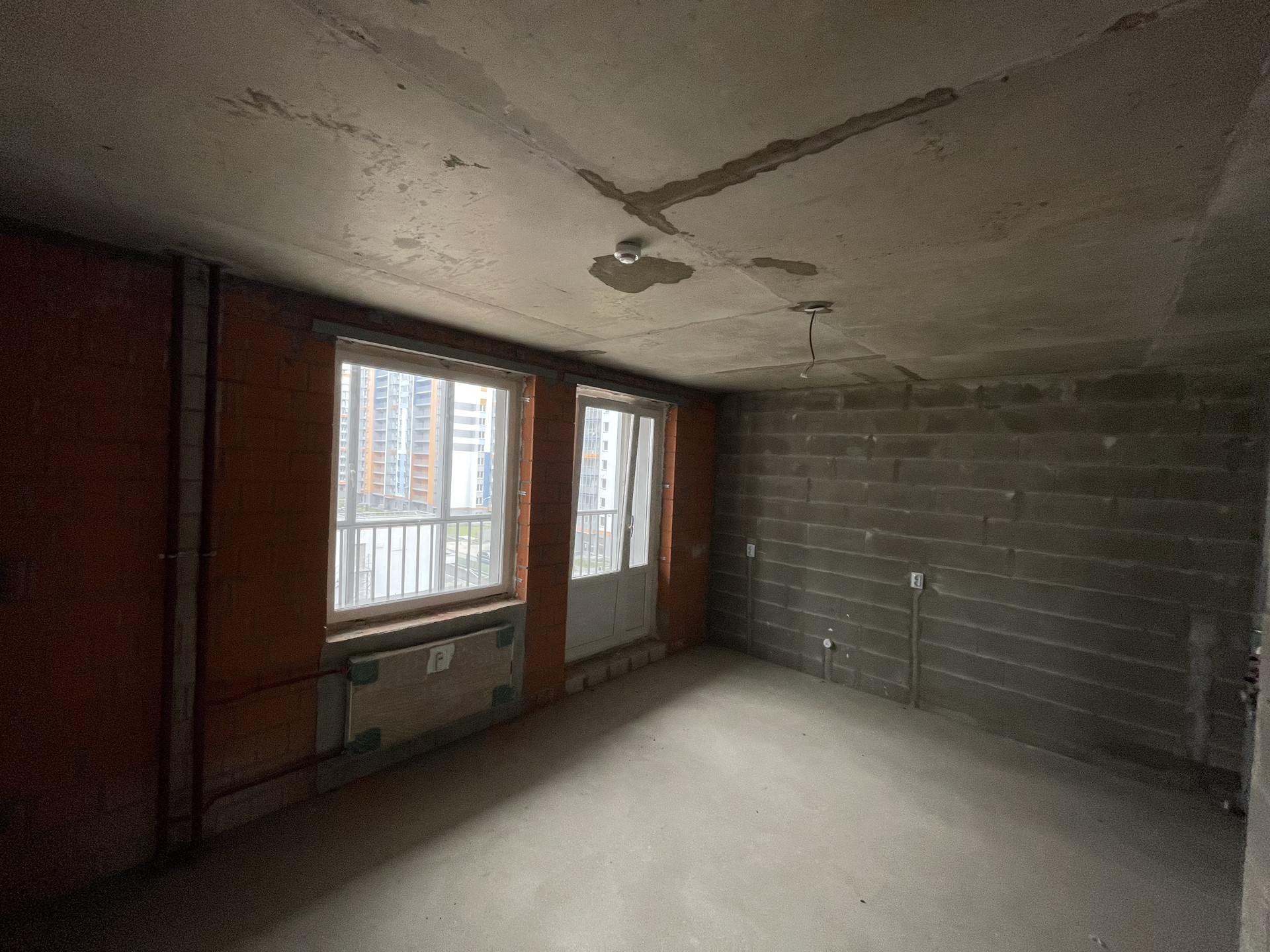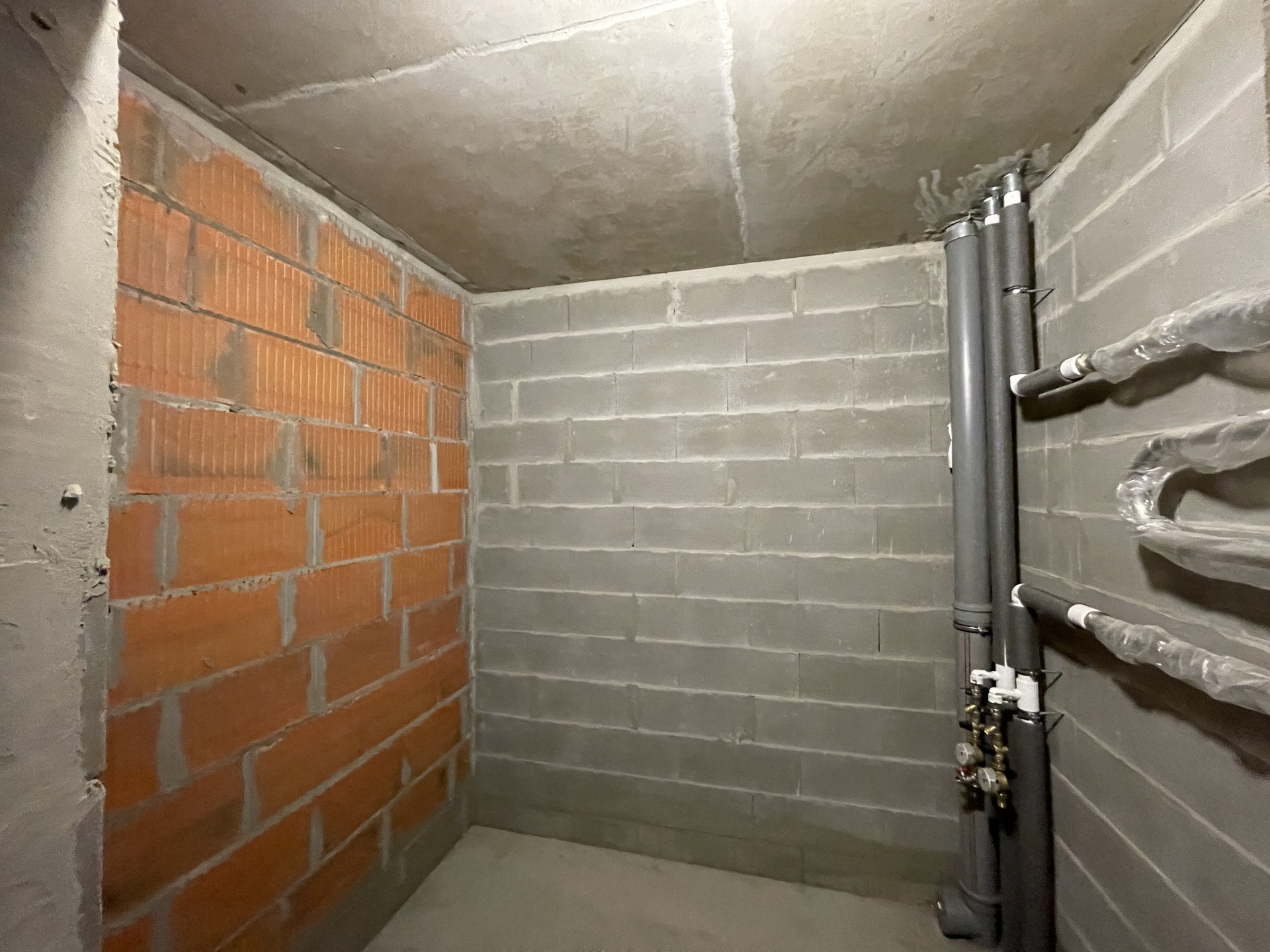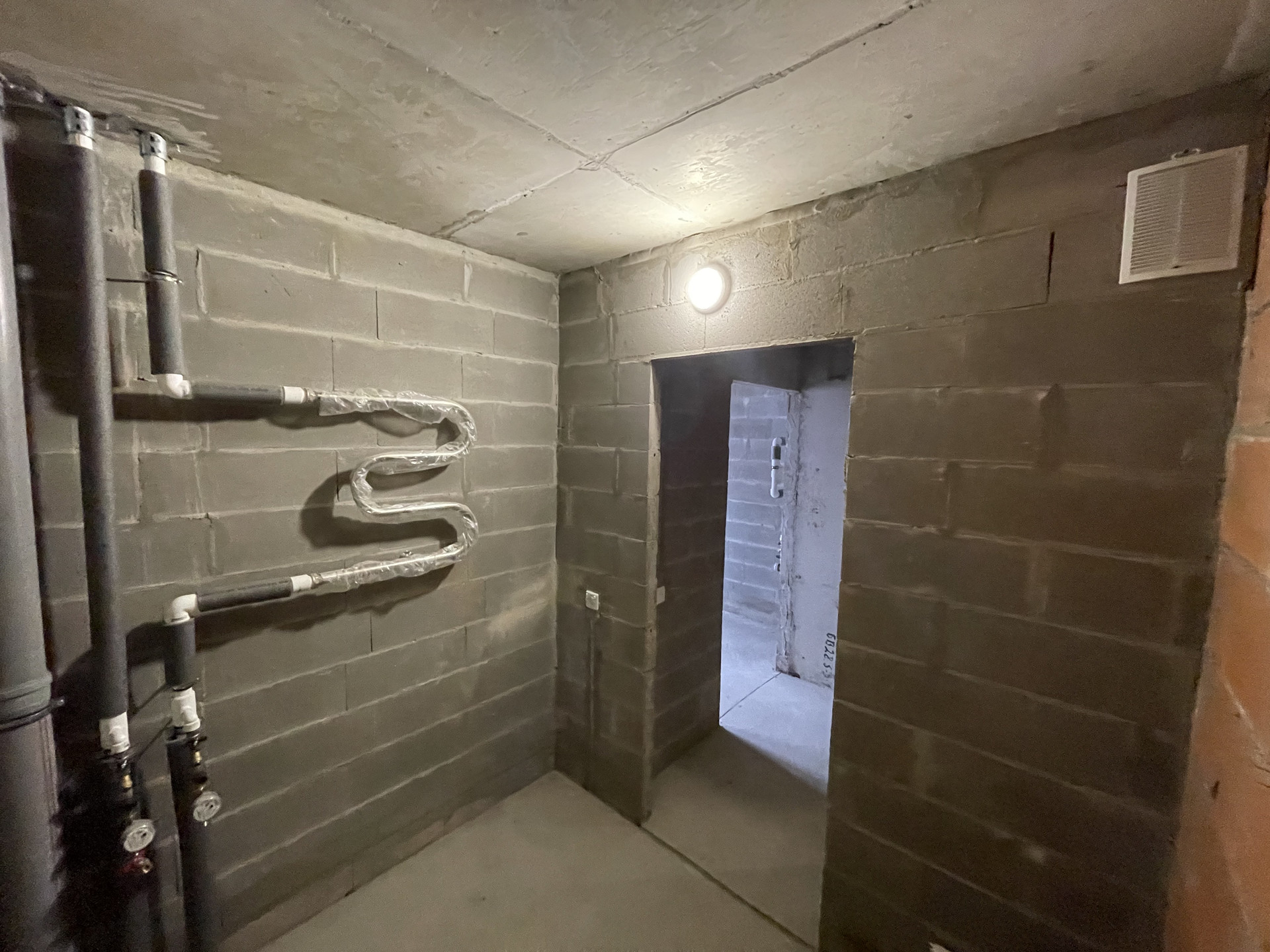 Пол стяжка, смонтированы выпуски разводки холодного и горячего водоснабжения, выводы под сантехнику, установлены современные радиаторы.