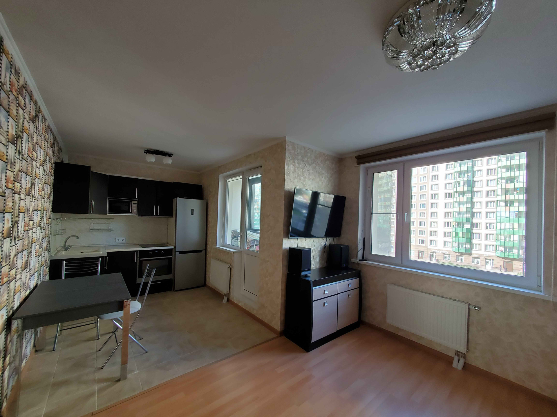 Квартира полностью обустроена для комфортного проживания. Имеется мебель и кухня со встроенной бытовой техникой: плита, духовка, микроволновка, вытяжка, холодильник.