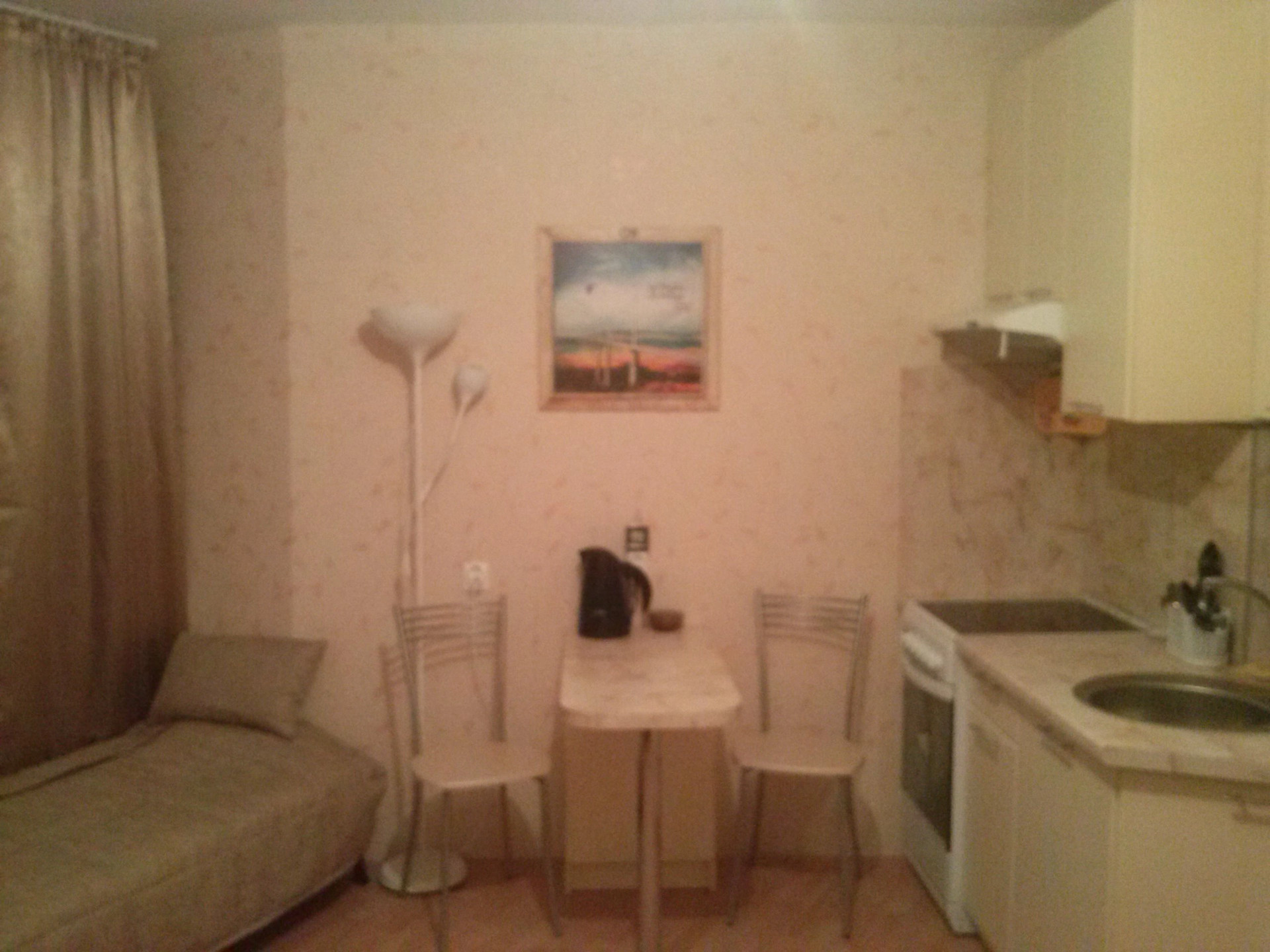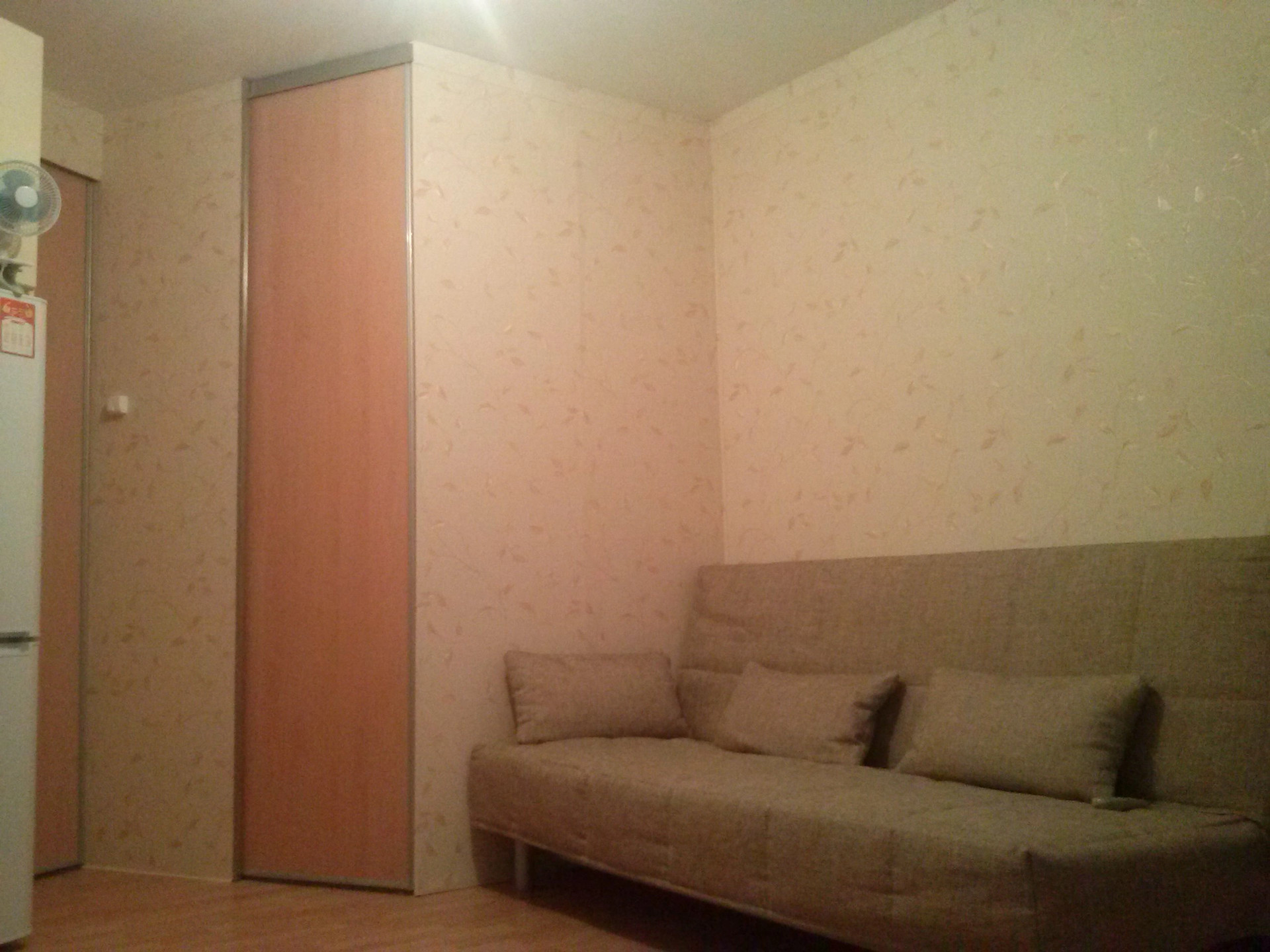 В студии оптимальное расположение встроенного шкафа и кухни,которые остаются новым хозяевам.