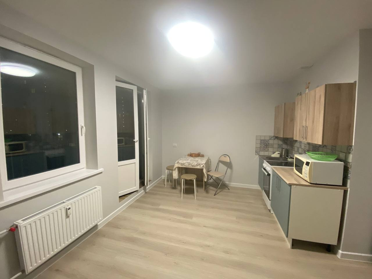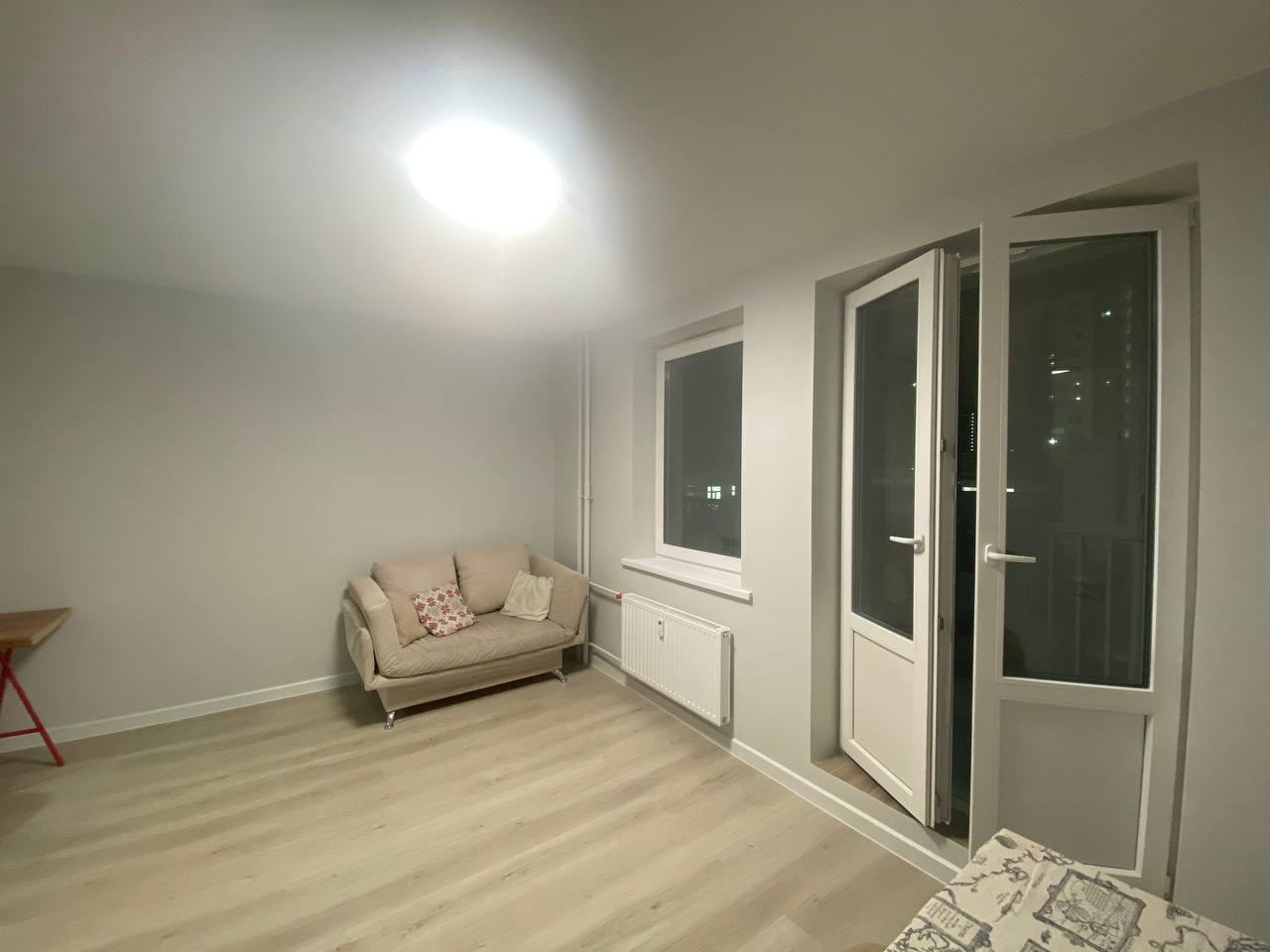 Очень удачная планировка. Просторная квадратная комната с возможностью зонирования. Большое окно и распашные двери на балкон. Балкон застеклен, на полу керамогранит. В коридоре есть место под гардеробную. Просторный санузел с большой ванной, шкафом для мелочей и теплым полом. Ремонт выполнен из качественных материалов. На полу ламинат 33 класса, стены и потолок выравнены и окрашены.
