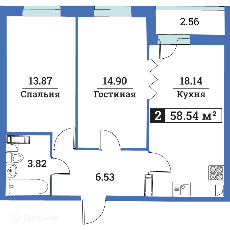 Общая площадь 58.54 м2