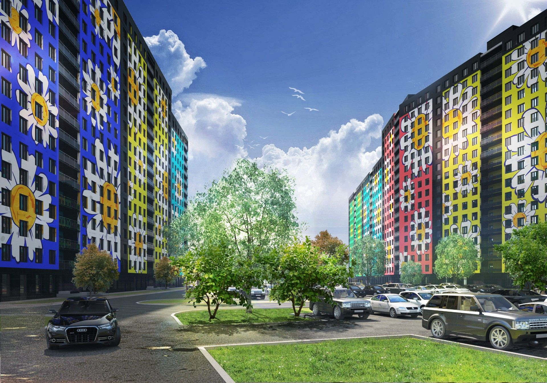 Придомовая территория благоустроена зелеными зонами и прогулочными дорожками. Двор разделен на зоны отдыха для взрослых и детей, а спортивные и игровые площадки подходят для всех возрастов.