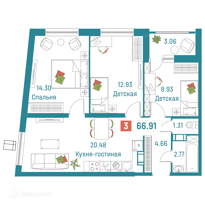 Общая площадь 66.91 м2
