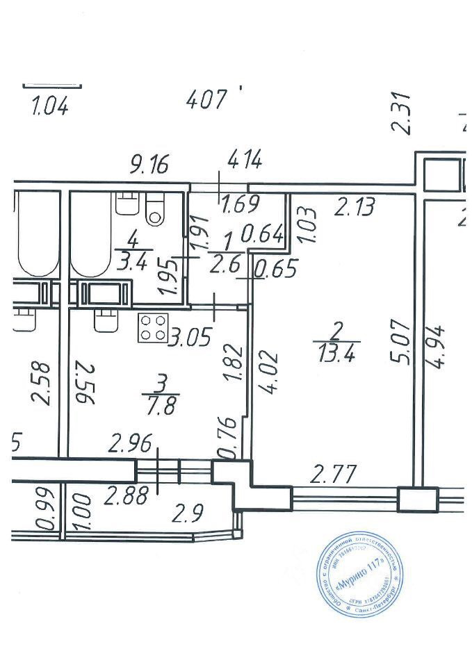 Жилая площадь 13.4 м2