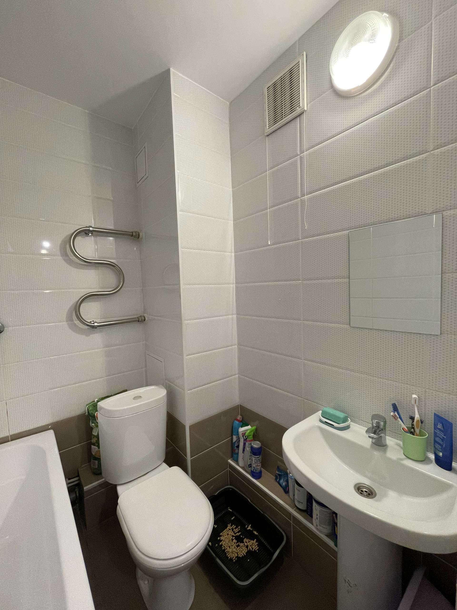 Санузел совмещен, установлена ванна, на стенах и на полу плитка.