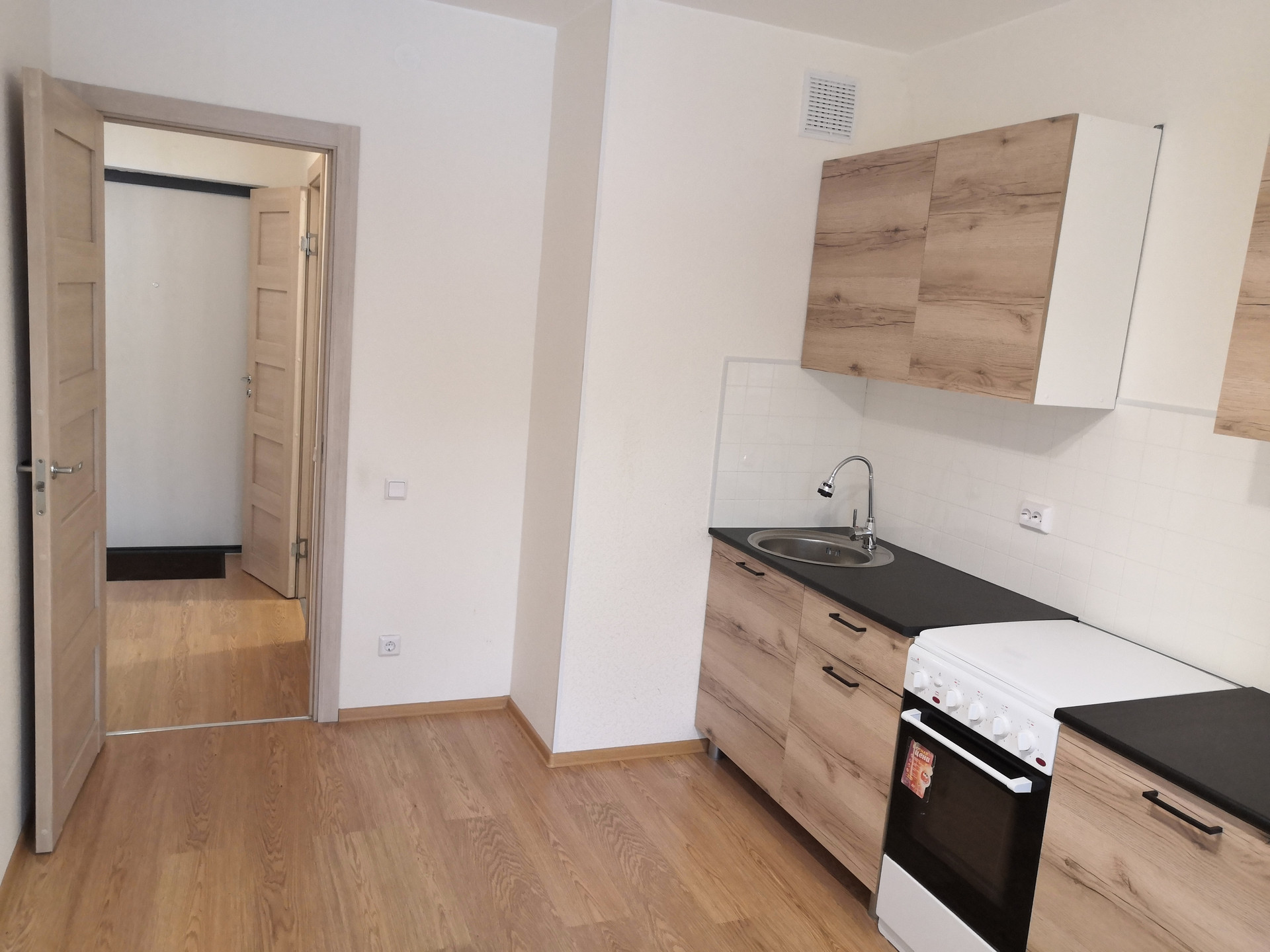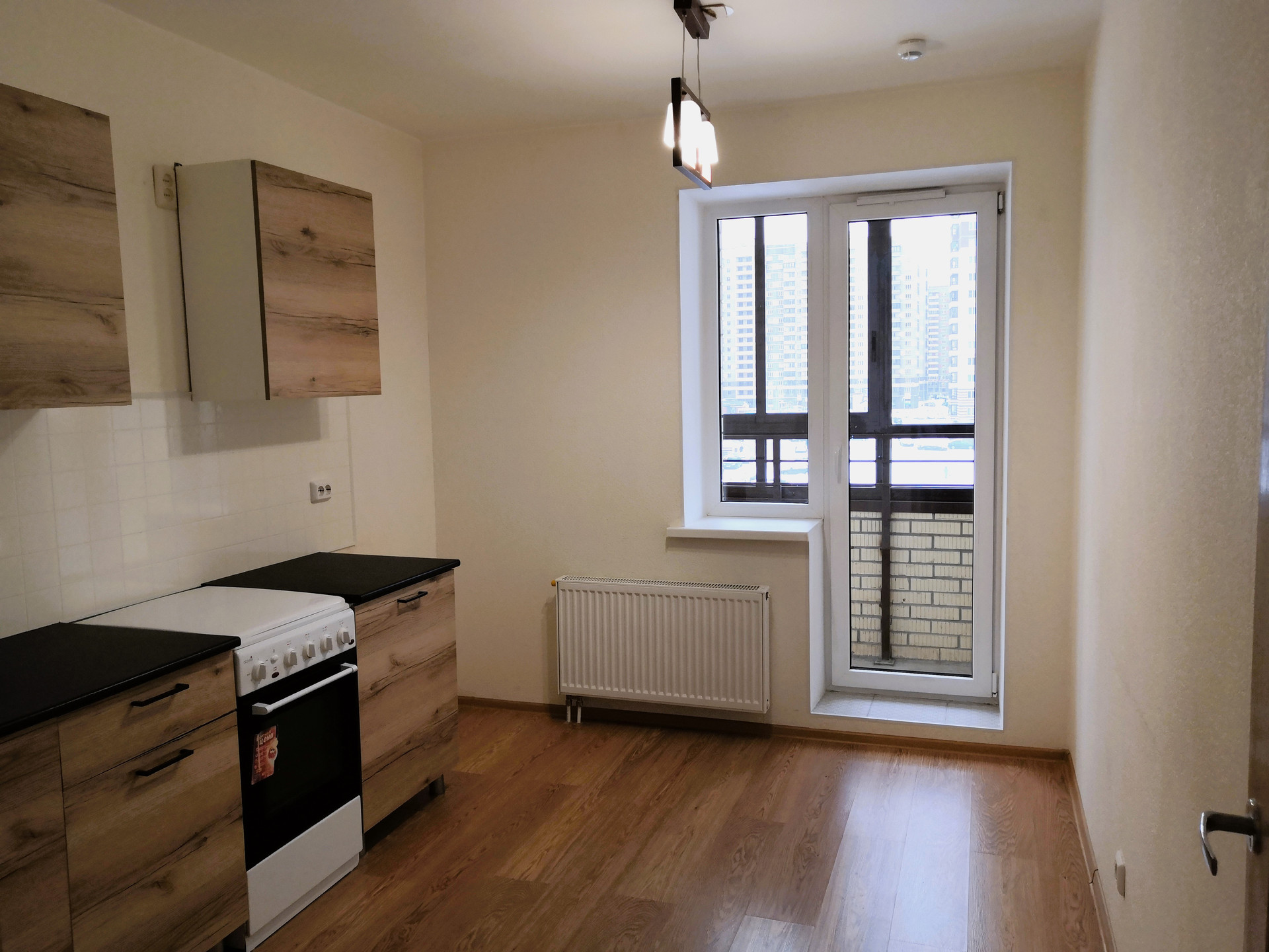 В комнате есть место для обустройства гардеробной. Мебель и плита на кухне остаются покупателям. В ванной кафельная плитка и необходимая сантехника, есть место и коммуникации для стиральной машины, установлены приборы учета. Радиаторы отопления с терморегулятором, в помещениях отсутствуют стояки отопления - разводка труб в полу.