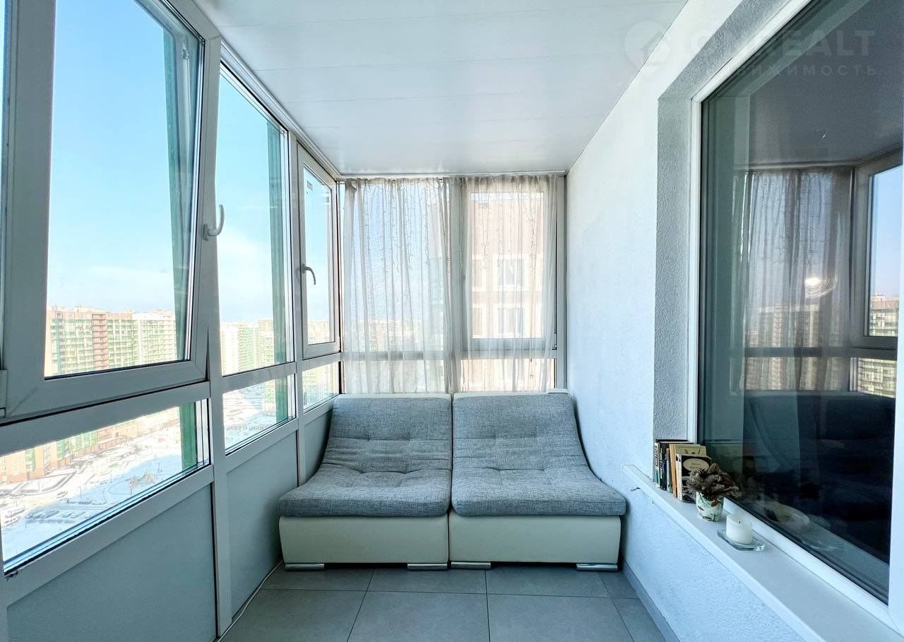 На лоджии оборудована зона отдыха: остекление заменено на теплое, установлен теплый пол. Сколько там было встречено потрясающих праздничных салютов и закатов, эх) Видно далеко, даже башню Охты, и есть обоснованное подозрение, что ни одна новостройка не перекроет этот вид.