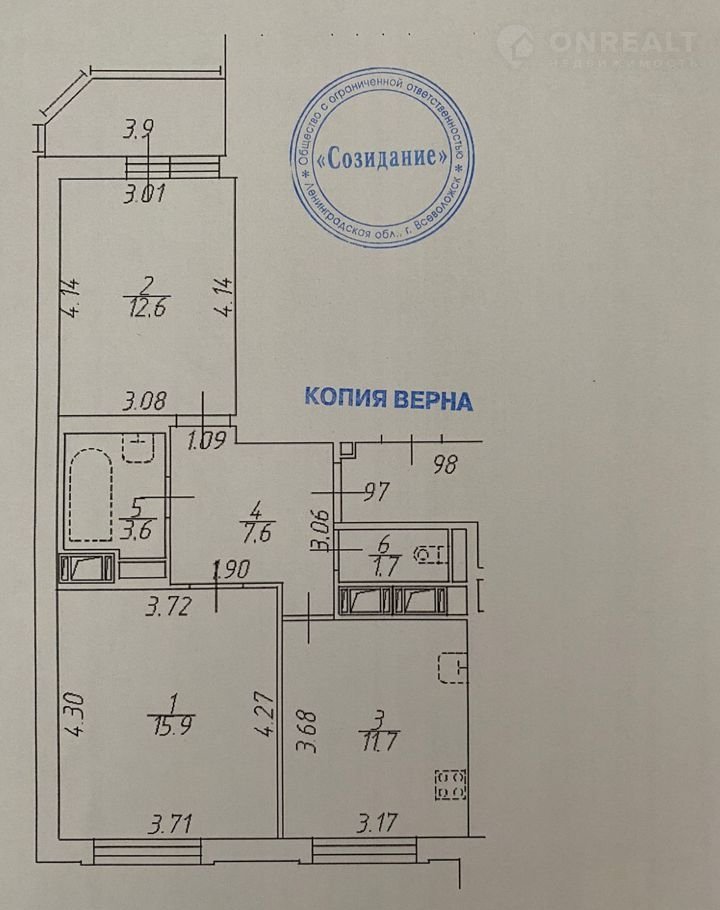 Площадь квартиры – 53, 2 метра. Кухня – 11,7 метра. Гостиная – 15,9, спальня – 12,6, коридор – 7,6, туалет – 1,7, ванная – 3,6, лоджия – 3,9. Потолки 2, 75.