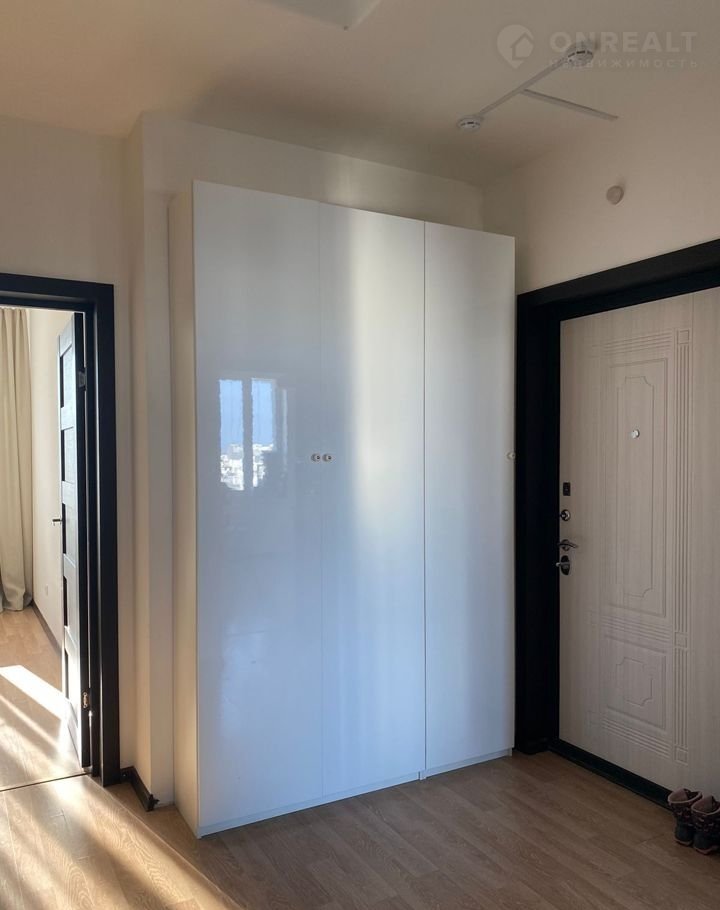 В коридоре стоит белый шкаф для верхней одежды, который также остается новым владельцам.