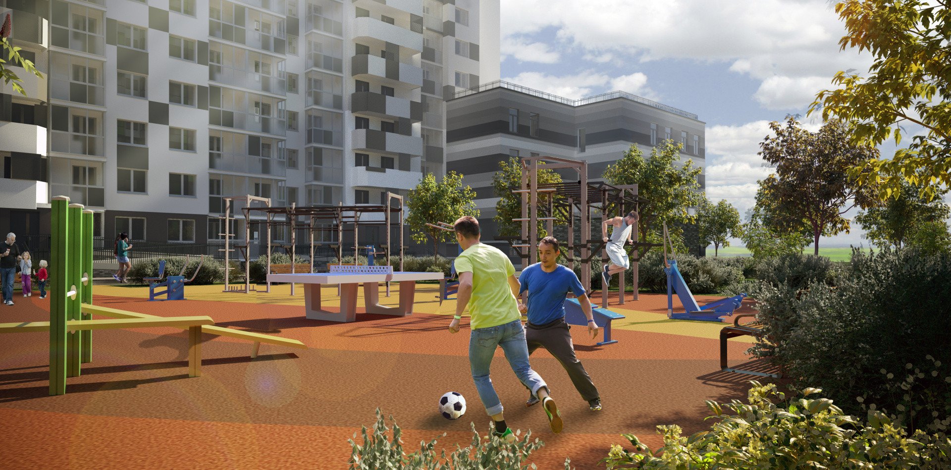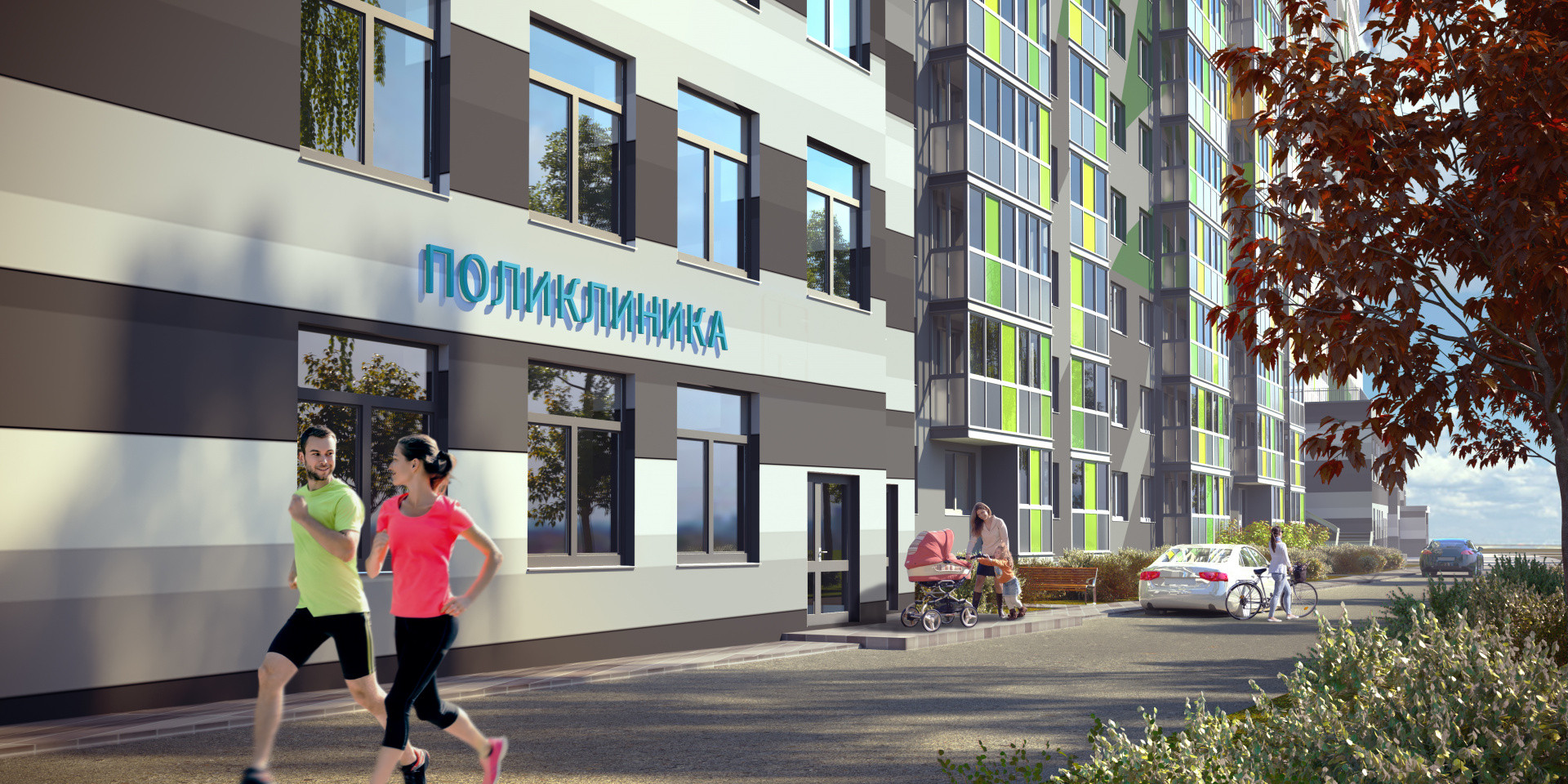 Внутренняя территория полностью закрыта от посторонних. На территории ЖК ведется видеонаблюдение. На первых этажах расположены коммерческие помещения, а также комнаты для хранения колясок и велосипедов. Придомовая территория благоустроена детскими и спортивными площадками. Свой детский сад и поликлиника.