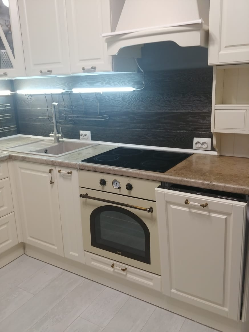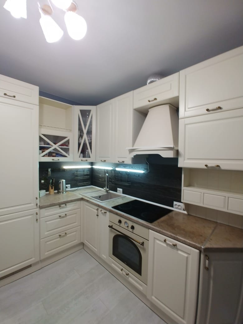 Установлен качественный кухонный гарнитур со встроенной техникой: холодильник, посудомоечная машина, духовой шкаф, варочная панель. СВС с грилем. На кухне есть вся необходимая посуда и утварь.