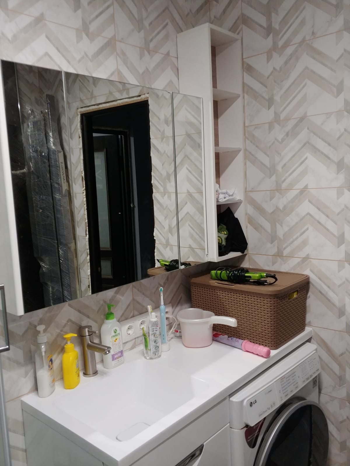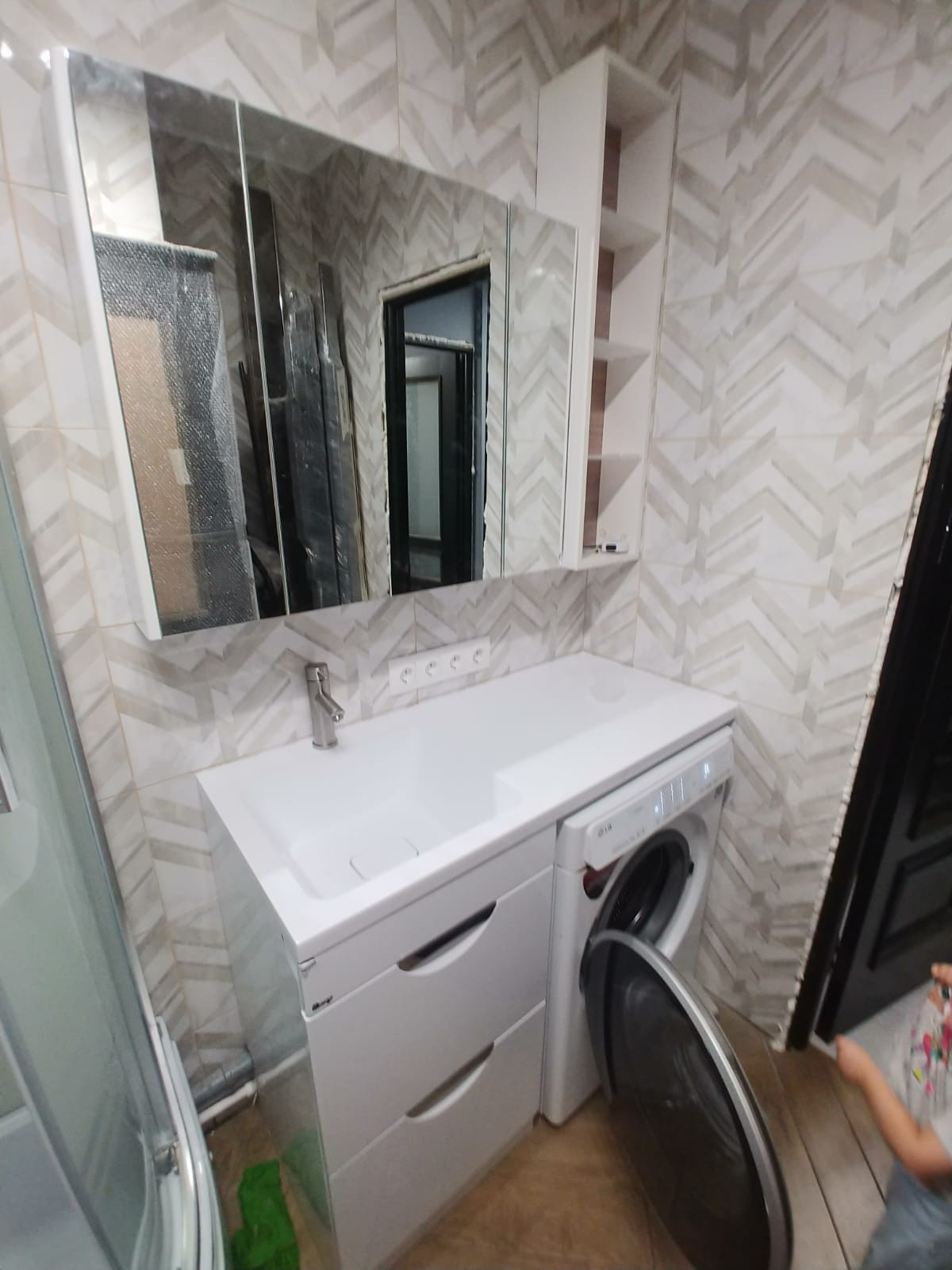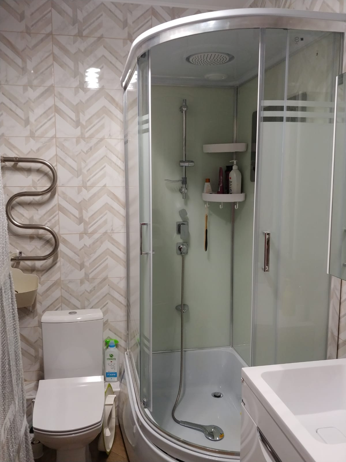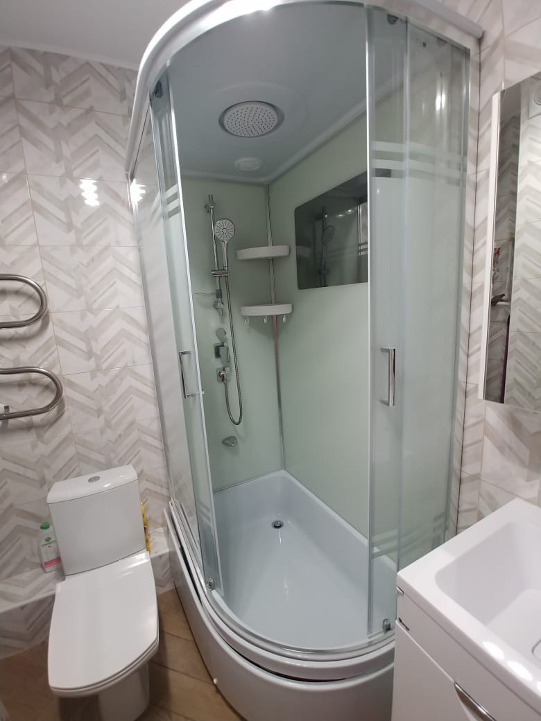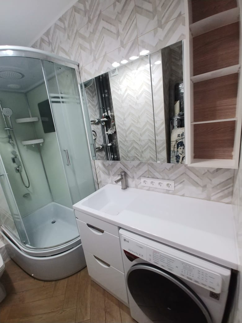 В ванной душевая кабина с высоким поддоном, можно набирать ванну, купать ребенка. Раковина-столешница, подвисные шкафы, унитаз с микролифтом.