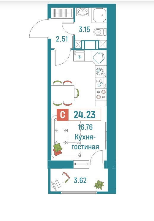 Общая площадь 24.23 м2
